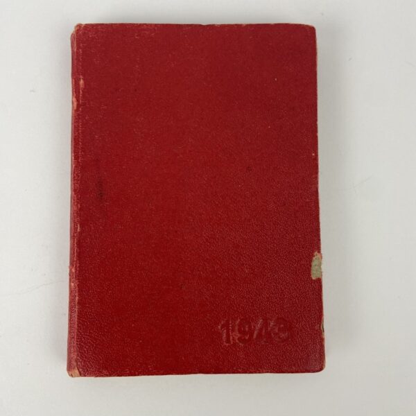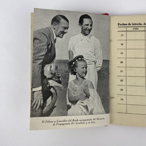 Antigua agenda militar española del año 1943, con tapas duras rojas y grabado del año en la portada. Contiene calendario anual, citas y numerosas fotografías de propaganda incluyendo imágenes de Hitler, Goebbels y la División Azul.