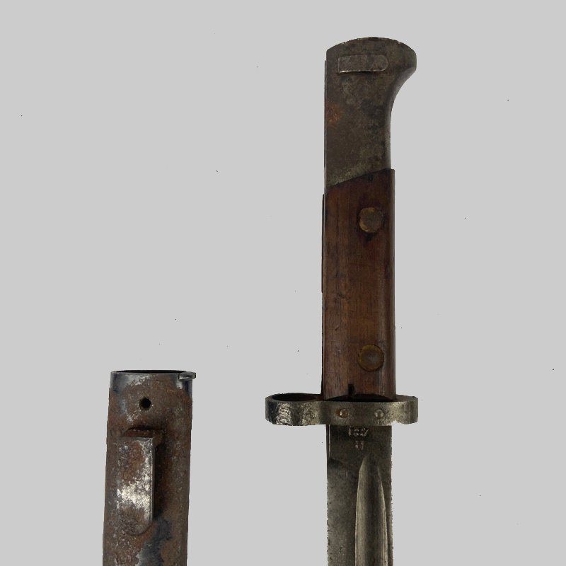 Ejemplar acompañado de su vaina metálica original. Presenta pátina y desgaste acorde a la antigüedad, con marcas de uso visibles tanto en la hoja como en la vaina, tal como se aprecia en las fotografías. Marcajes en el ricasso bien visibles.