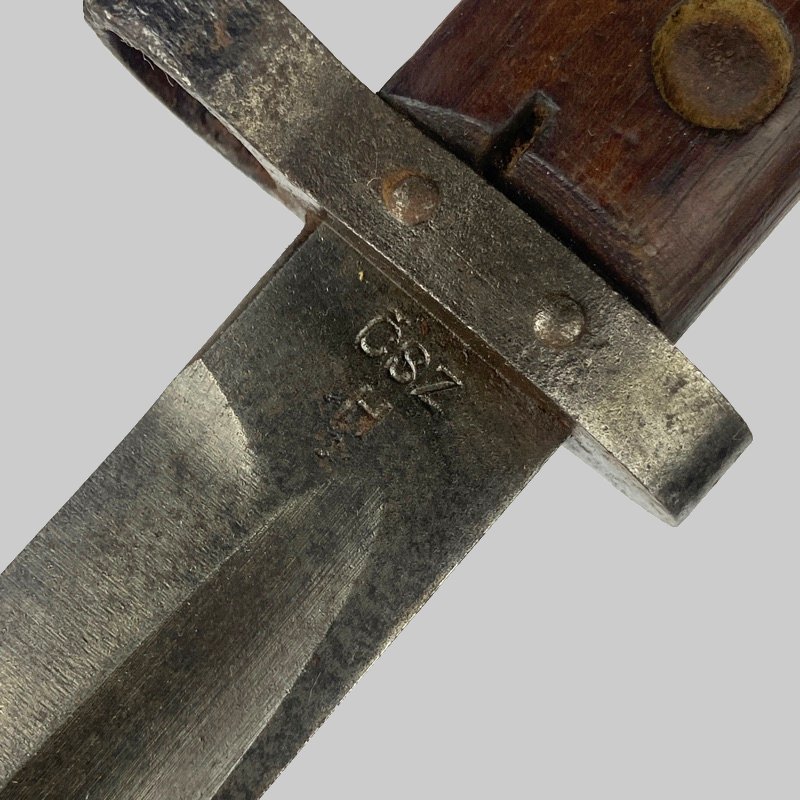 Bayoneta modelo VZ 24 para fusil checoslovaco Mauser VZ 24, con empuñadura de cachas de madera fijadas mediante remaches y pomo con sistema de anclaje para fusil tipo Mauser. Hoja de un solo filo con canal central y cruz recta con anilla para el cañón.