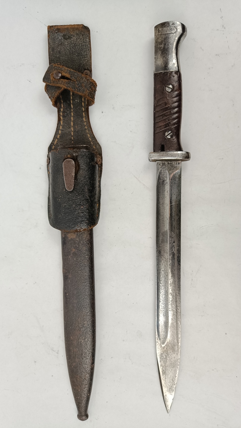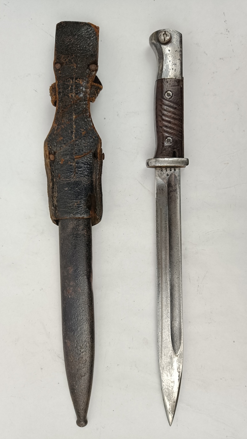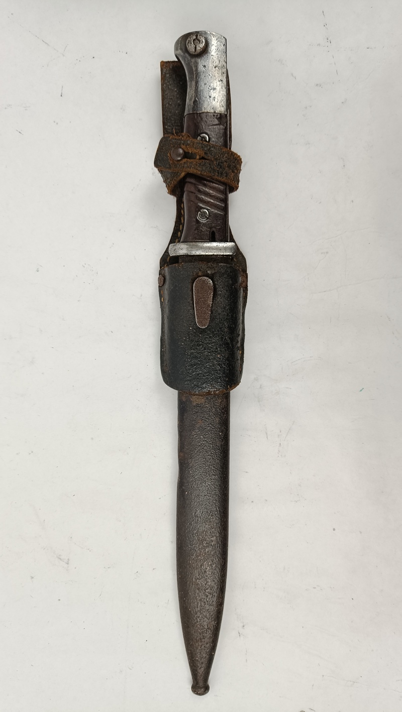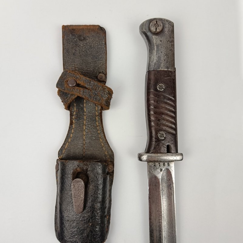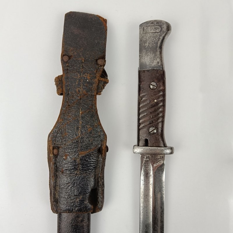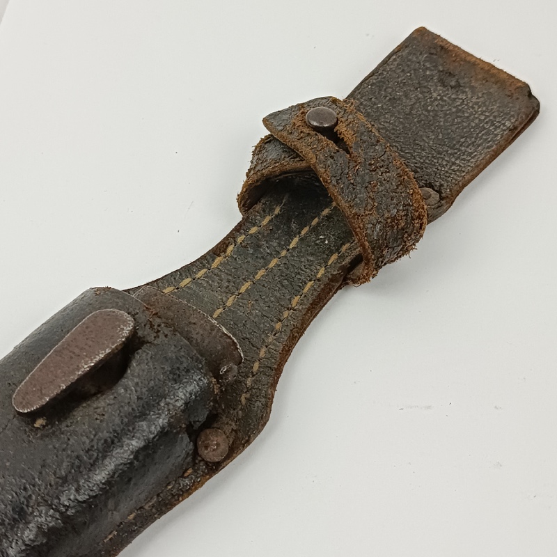 Vaina con tahalí de cuero negro. Bayoneta para rifle Mauser Kar98 de la Segunda Guerra Mundial, completa.