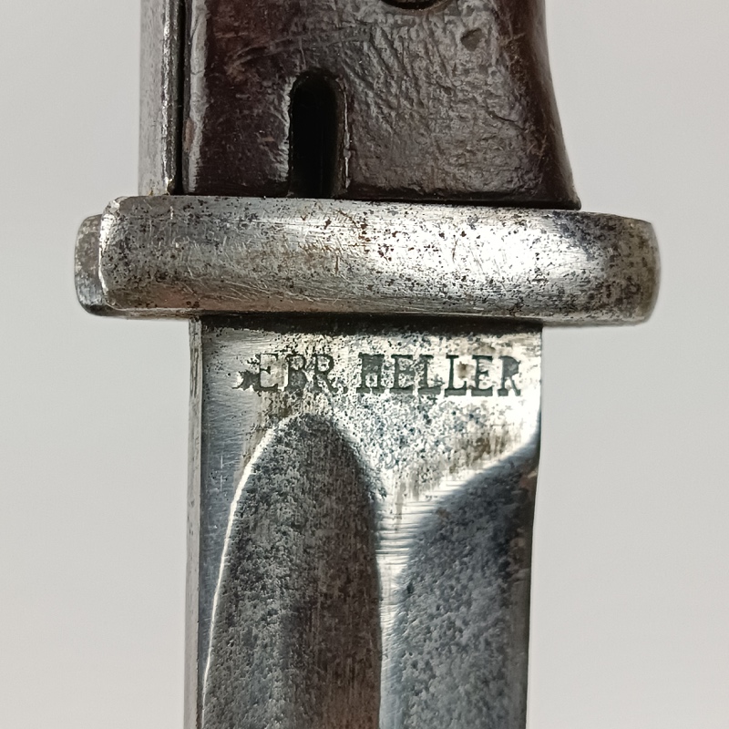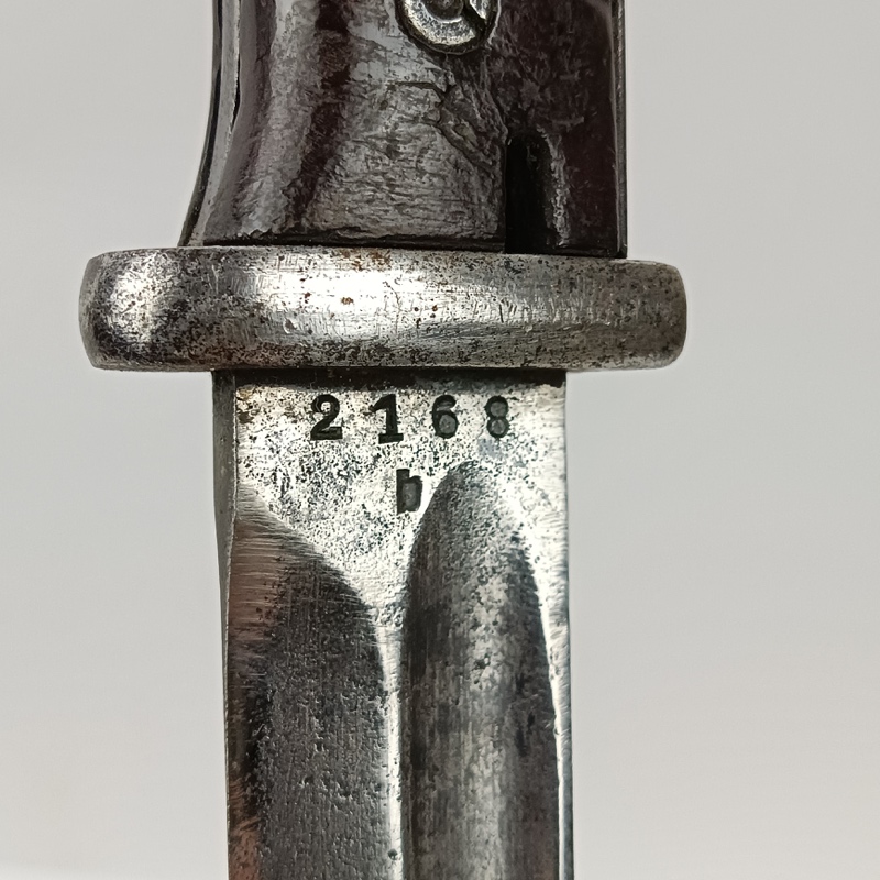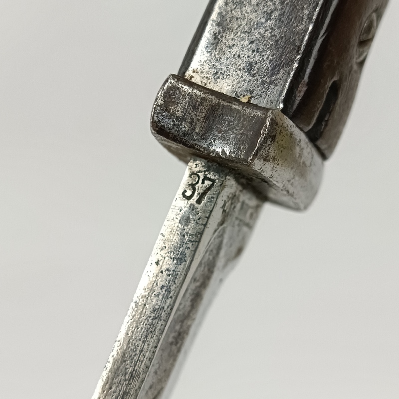 Bayoneta con hoja de acero de 25,5 cm de longitud aproximadamente, con marcaje en el ricasso. Producción de 1937 con cachas de madera.