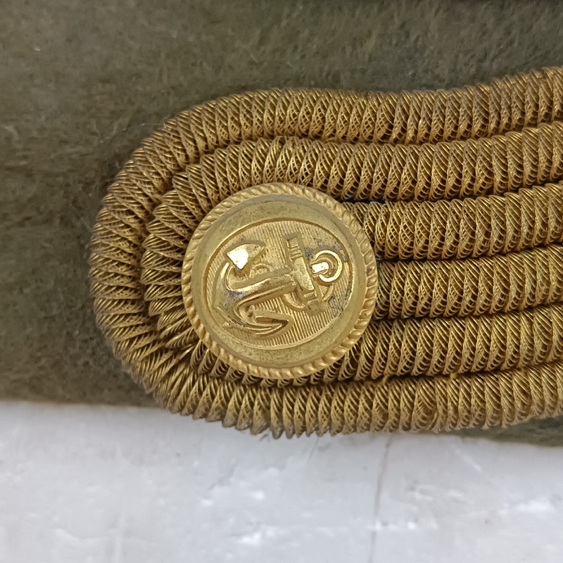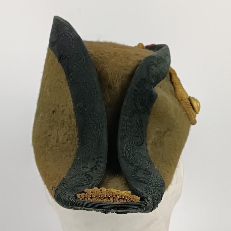 Bicornio ceremonial para Oficiales de la Armada, distinguible por las dos borlas doradas en los extremos del gorro que lo distinguen de los utilizados en otros servicios. En el frontal una gran banda entorchada dorada de canutillo de oro triple, torcida sobre un botón dorado en relieve con el símbolo de la, Marina Francesa.