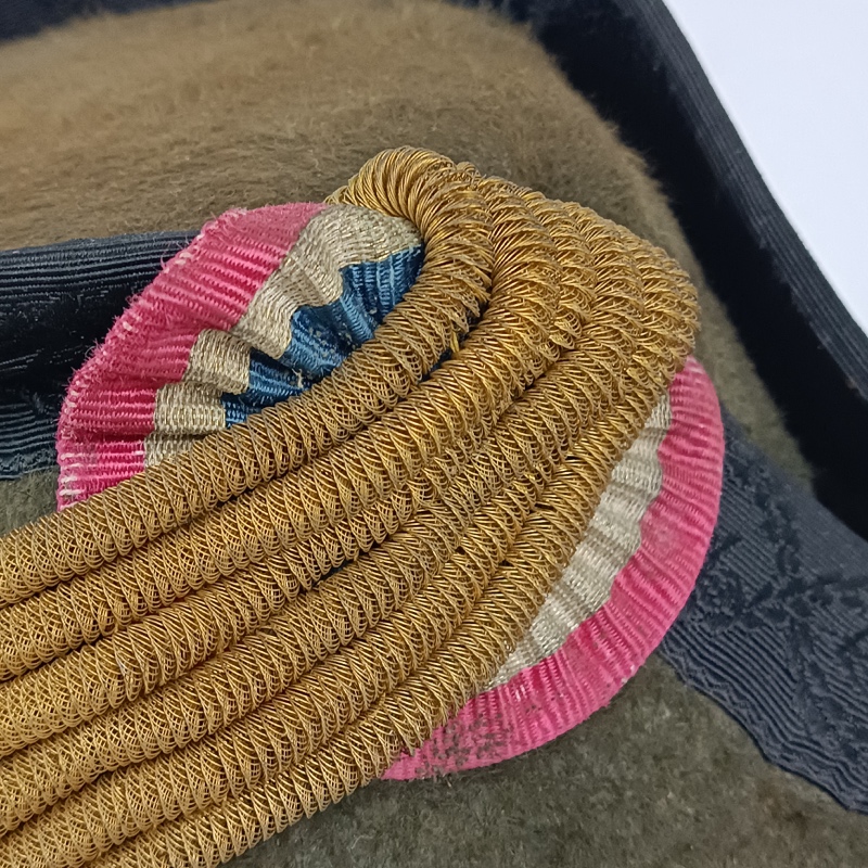 Fabricado en fieltro de color marronoso con borde bordado negro formado por una cenefa de hojas de roble en el centro de las cuales lleva un ancla. Interior de seda con marcaje del fabricante en la banda del sudadero.