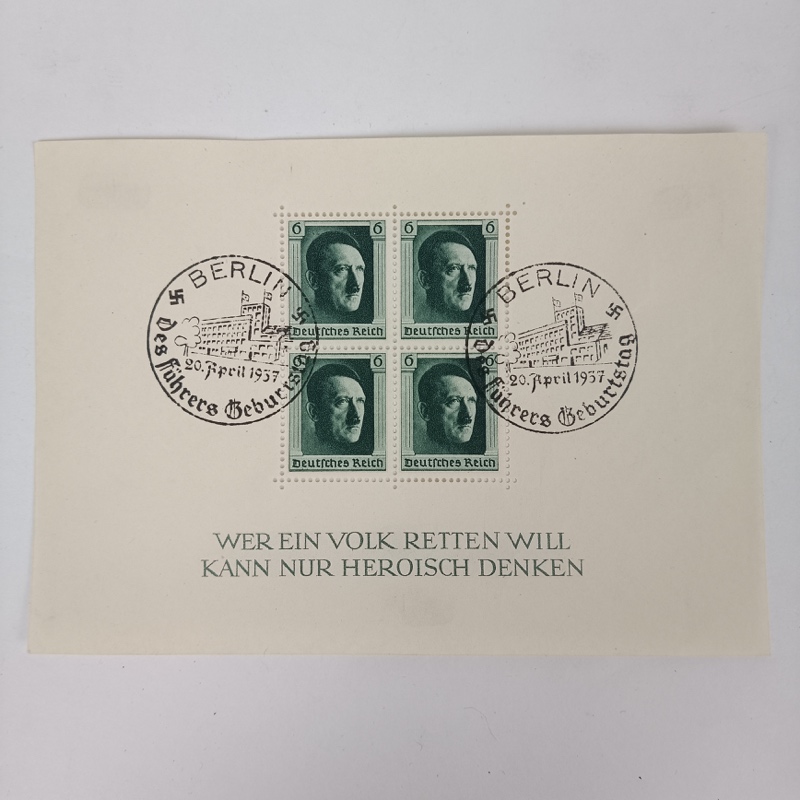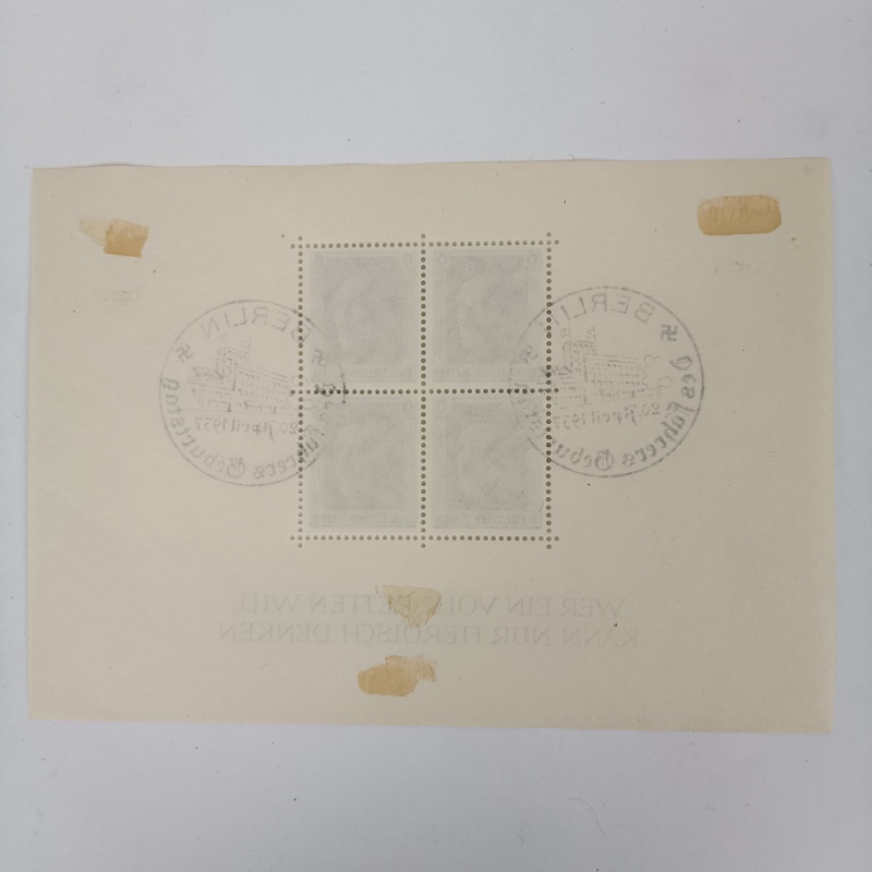 Bloque de sellos Tercer Reich de 1937, con matasellos conmemorativo en las esquinas.