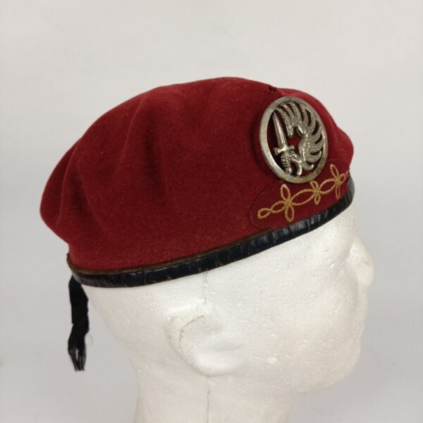 Boina de color granate con el símbolo de las tropas paracaidistas del Ejército Francés en el costado, sobre un parche de tela granate del mismo color bordado en hilo blanco con motivos tradicionales. Etiqueta en el interior de la misma.