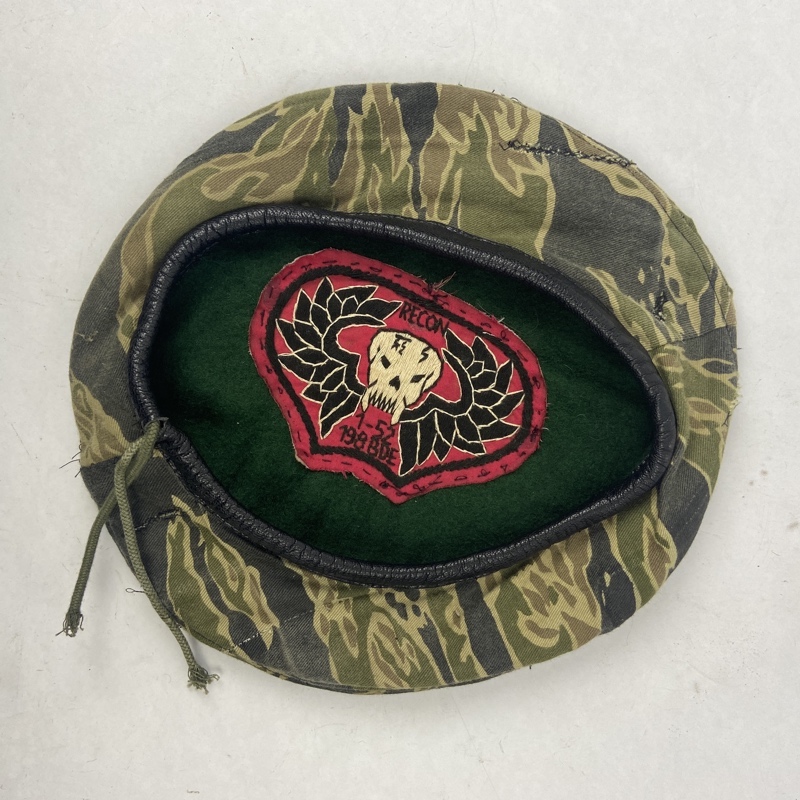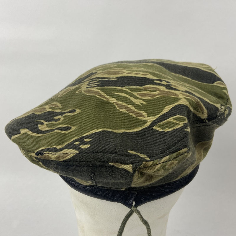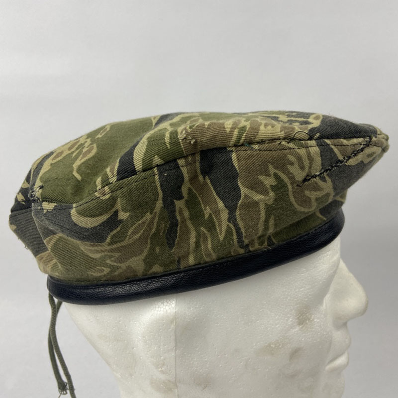 Boina en camuflaje Tiger Stripes, utilizado por el ARVN o Ejército de Vietnam del Sur y grupos de fuerzas especiales y ranger de los Estados Unidos durante el conflicto. Boina original, sin insignia, con un desgarro zurcido en el frontal de la misma. Parche de la unidad, también original cosido al interior, probablemente como recuerdo de un veterano de la Guerra de Vietnam.