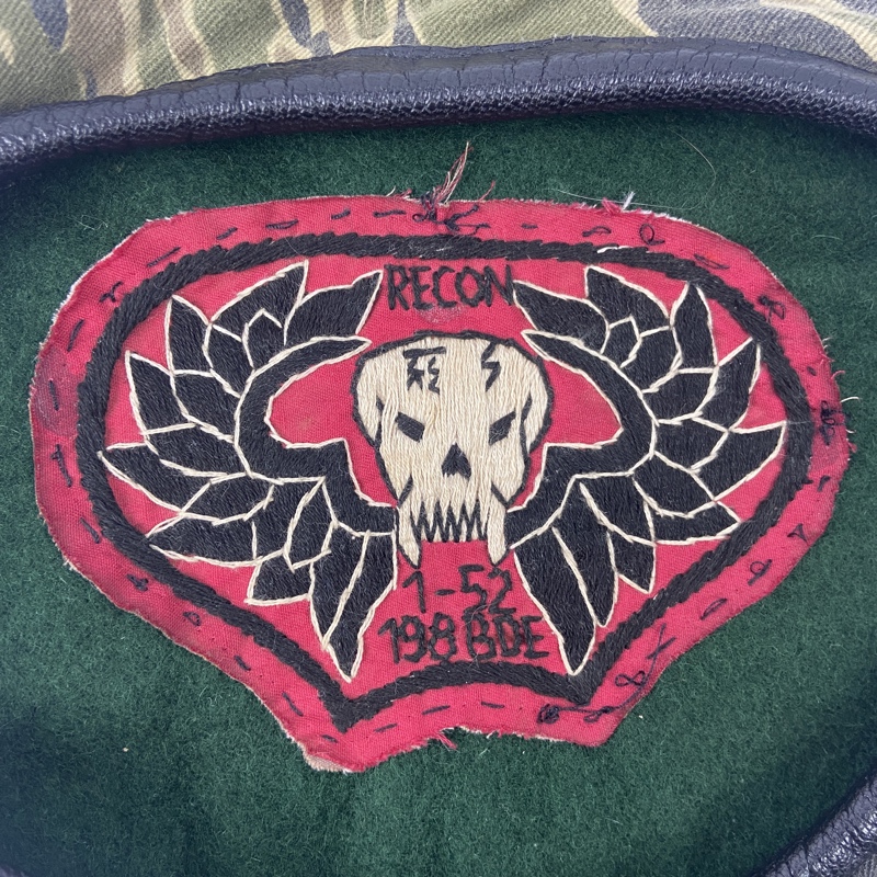 Boina de camuflaje Parche del 1er Batallón del 52 Regimiento de la 198 Brigada de Infantería del Ejército de los Estados Unidos o US Army, correspondiente a la Guerra de Vietnam.