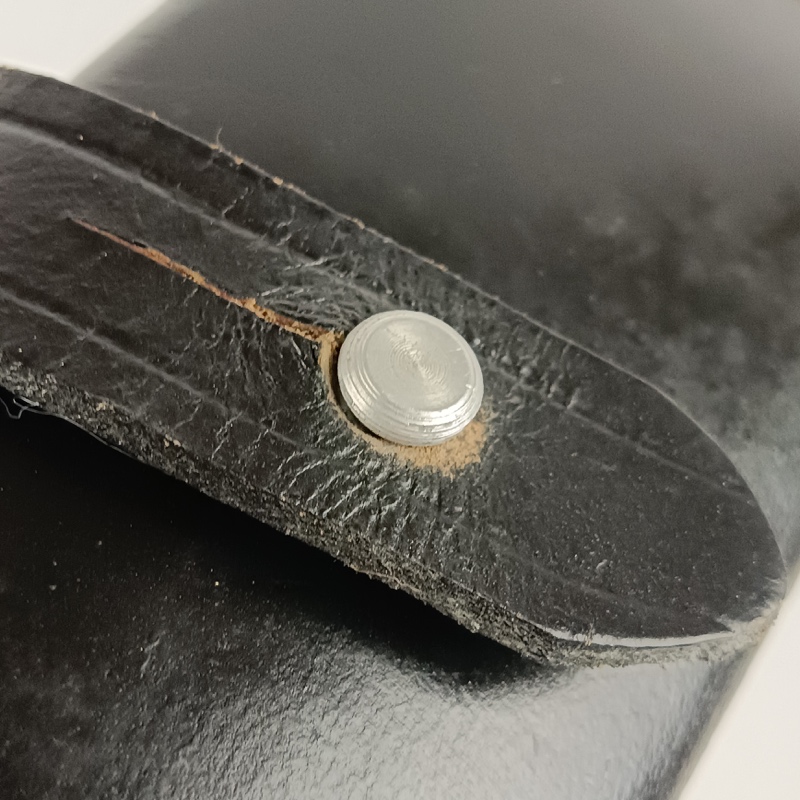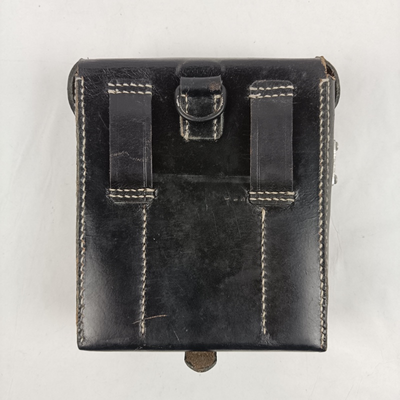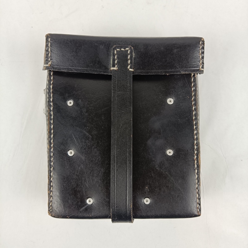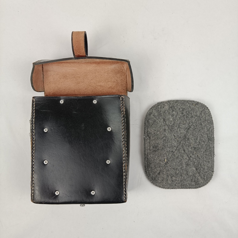 Bolsa de herramientas para ametralladora MG 34 / MG 42, fabricada en cuero negro. Con correa de cierre, presillas traseras para cinturón y almohadilla interna de fieltro marcada.