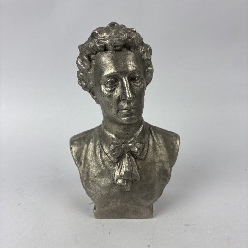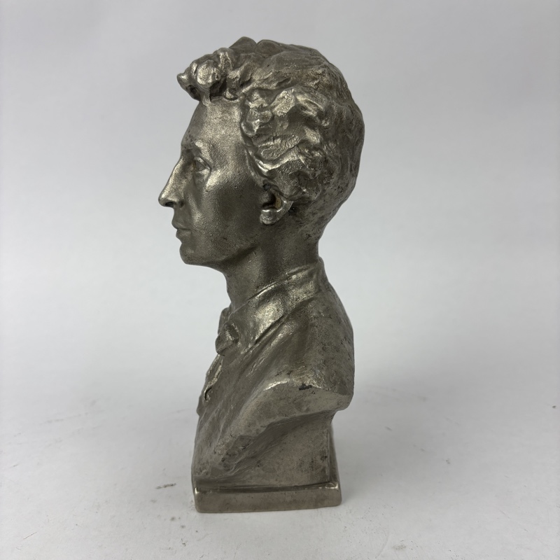 Busto de Alexander Block, poeta de la Unión Soviética, de metal mediante fundido y vaciado, hueco en el interior para reducir el peso de la pieza. Producido en Silumin, aleación popular en la Unión Soviética para la fabricación de estas piezas. En buen estado.