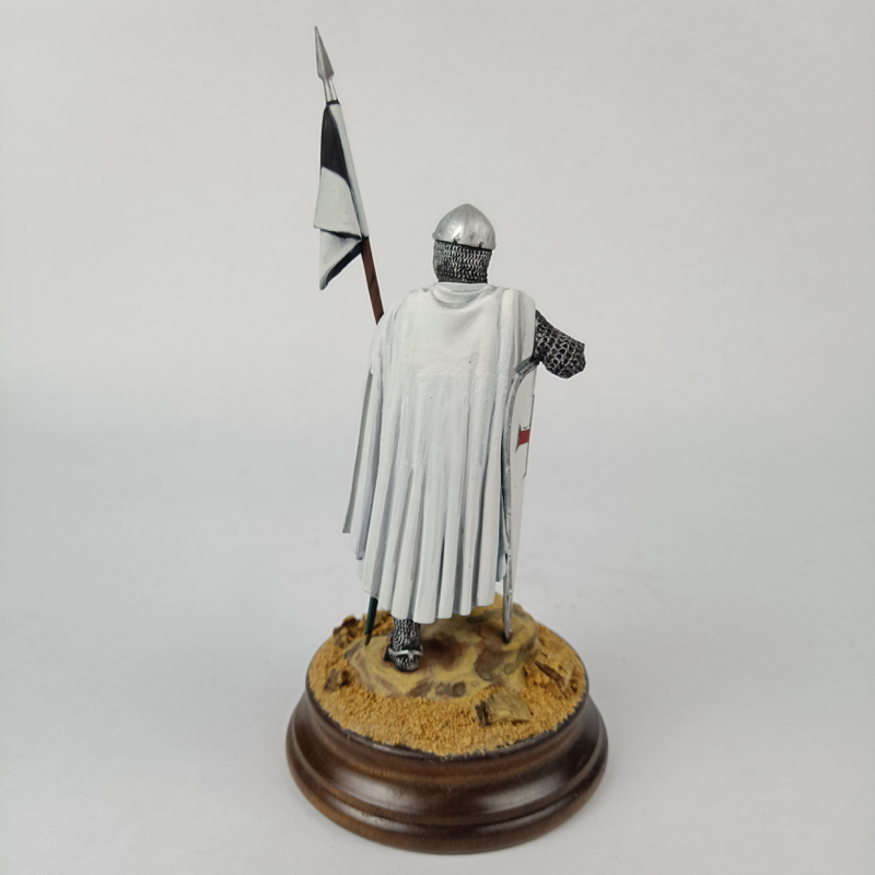Miniatura que representa a un caballero templario del siglo XII, correspondiente al periodo de las Cruzadas, equipado con cota de malla completa, casco cónico, escudo y lanza con estandarte, vistiendo la característica túnica blanca con cruz roja de la Orden del Temple. La figura se presenta sobre base decorativa con terreno arenoso, evocando escenarios propios de las campañas en Tierra Santa.