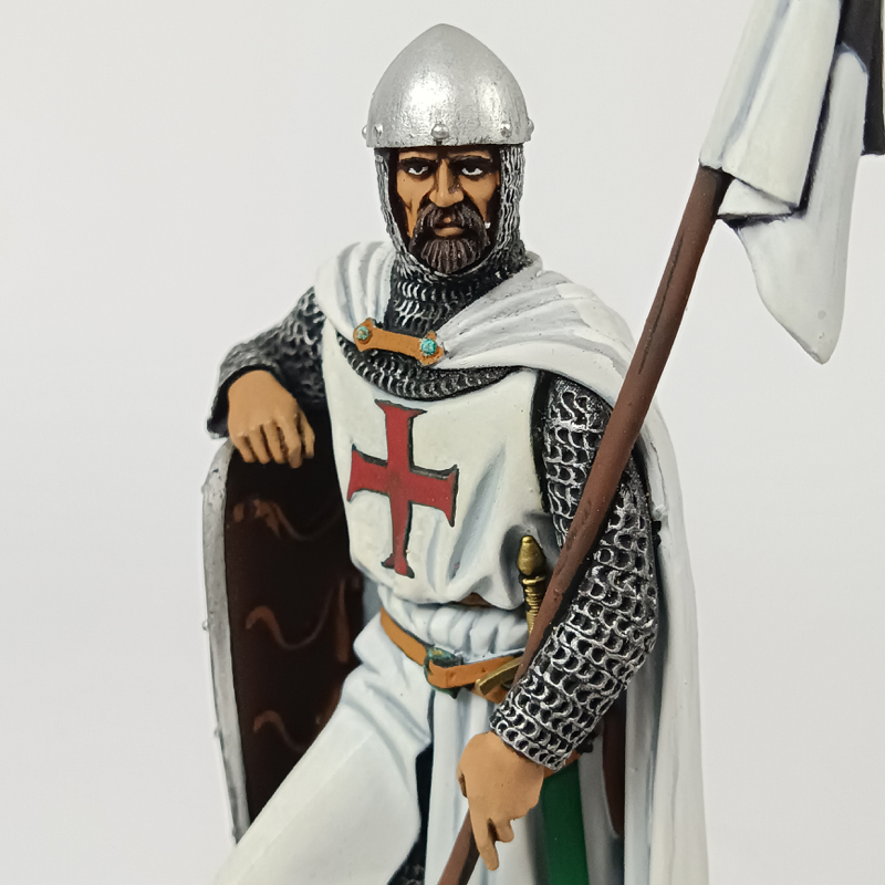 Figura de aproximadamente 90 mm, correspondiente a escala 1:20, fabricada en resina y perteneciente a la marca Andrea Miniatures. Miniatura pintada a mano con gran nivel de detalle, destacando especialmente el trabajo en la cota de malla, el sombreado en la túnica blanca, los detalles del rostro y el estandarte, así como el acabado del terreno y la base decorativa. Conjunto muy vistoso y representativo, ideal para colección o exposición, tal como se aprecia en las fotografías.
