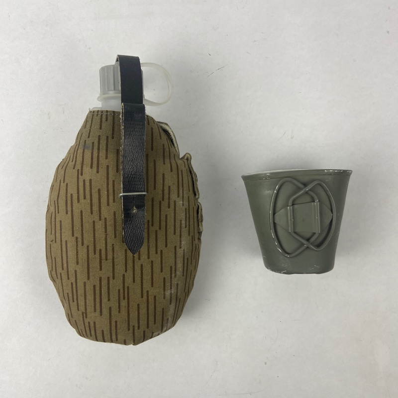 Con funda en camuflaje Strichtarn y correa de cuero para sujeción. Incluye cantimplora de plástico y taza de aluminio esmaltada. Conjunto práctico y resistente en perfecto estado.