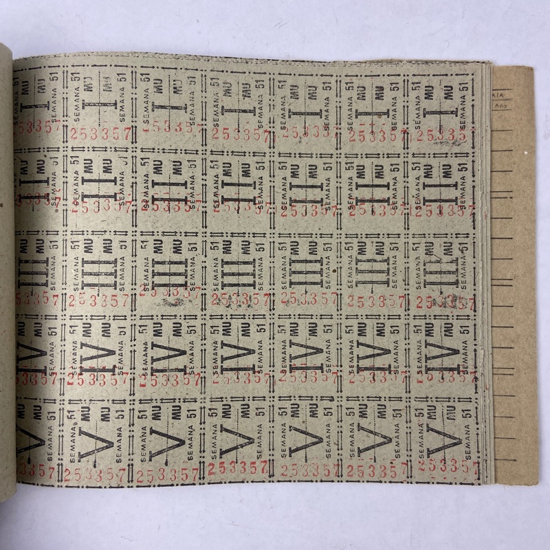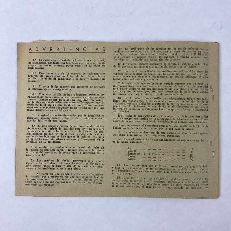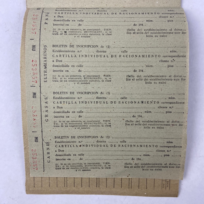 Cartilla de racionamiento de los años 40. Cartillas de papel con tapa de cartón y cupones de racionamiento para artículos esenciales variados. En buen estado de conservación.
