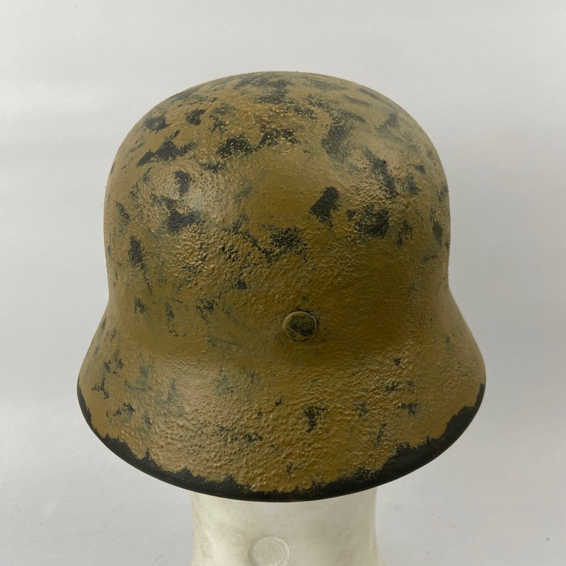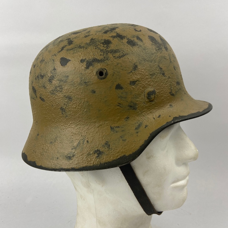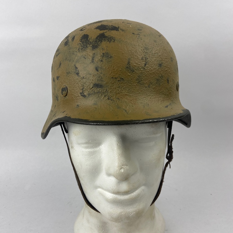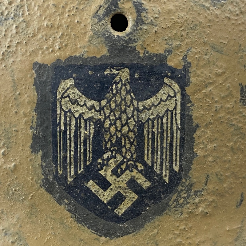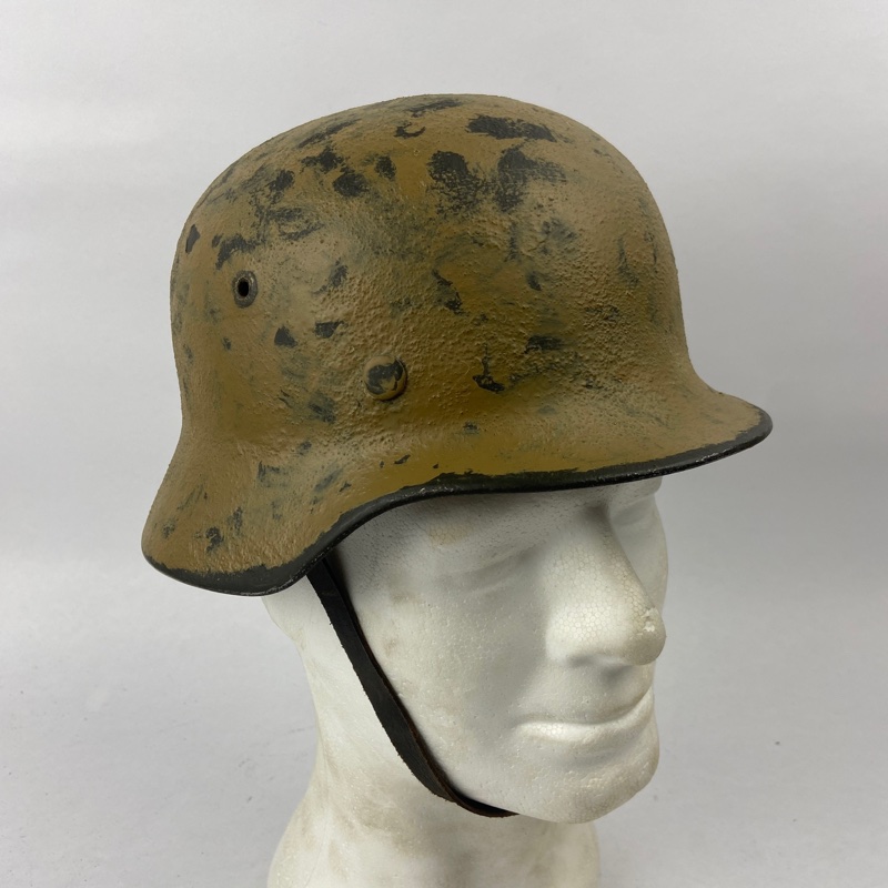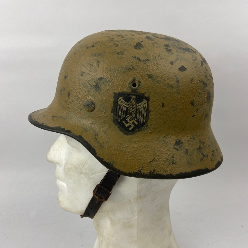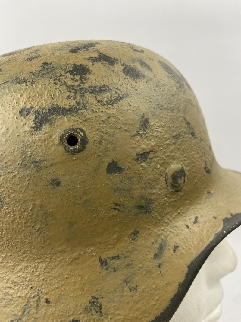 Modelo con calca de la Wehrmacht en el lateral y pintura khaki usada en el norte de África. Apariencia exterior magnifica tal cual fueron usados por el Afrika Korps. Olla sin marcaje de fabricante debido al estado del casco, que presenta picaduras en el metal.
