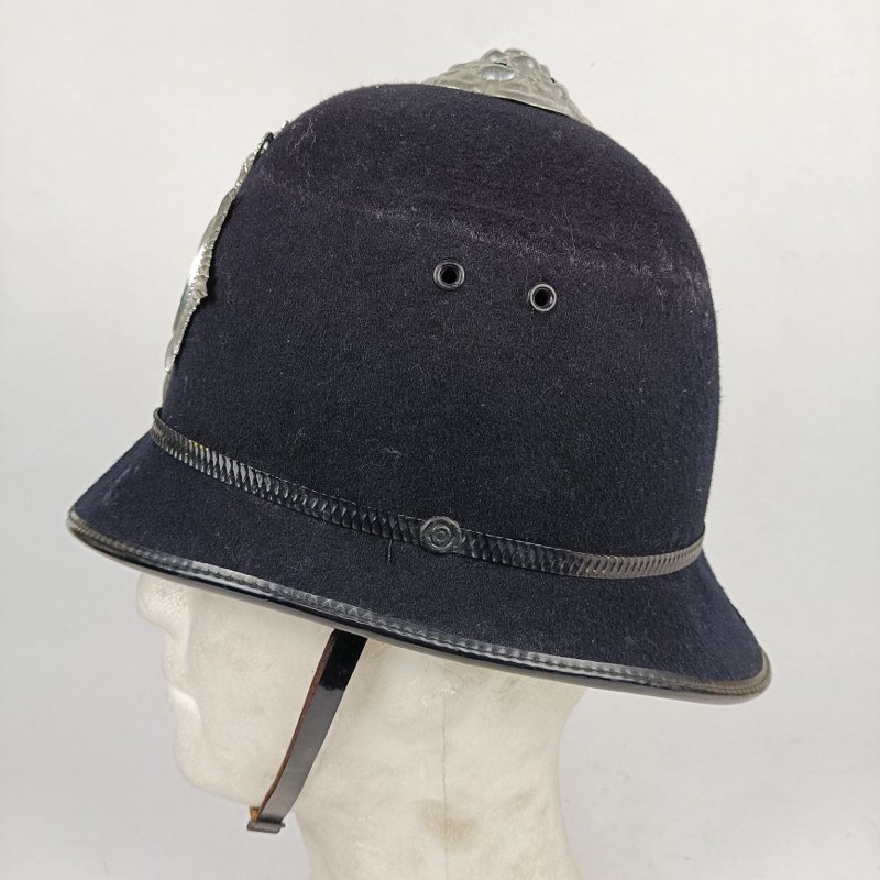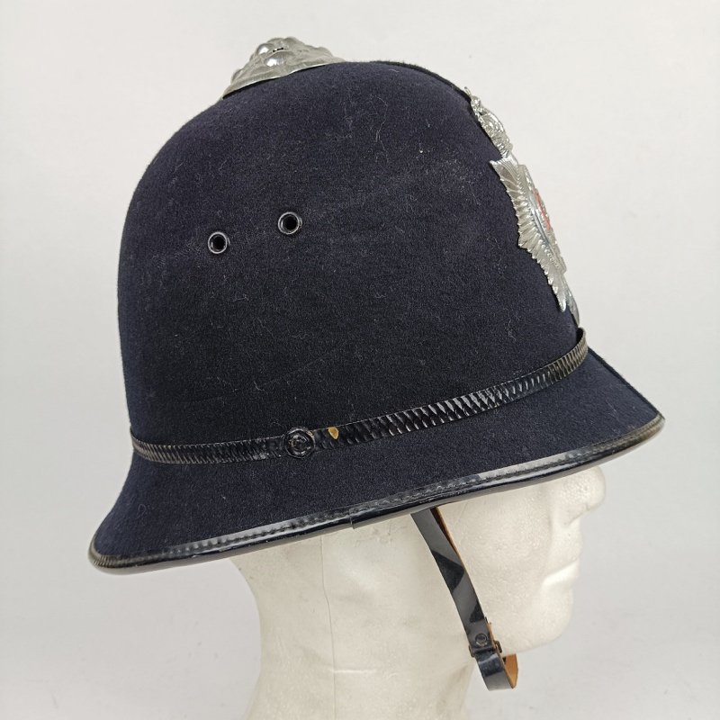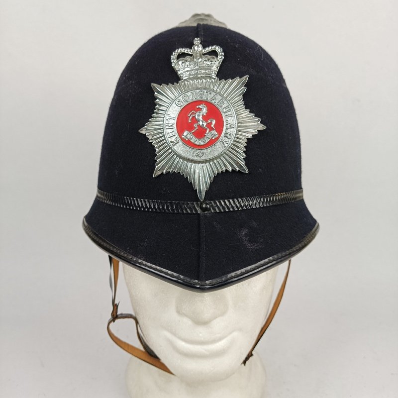 Casco Bobby de Policía de Reino Unido, con insignia frontal de Kent Constabulary, antiguo fabricado en corcho, con algún desperfecto menor en la funda azul.
