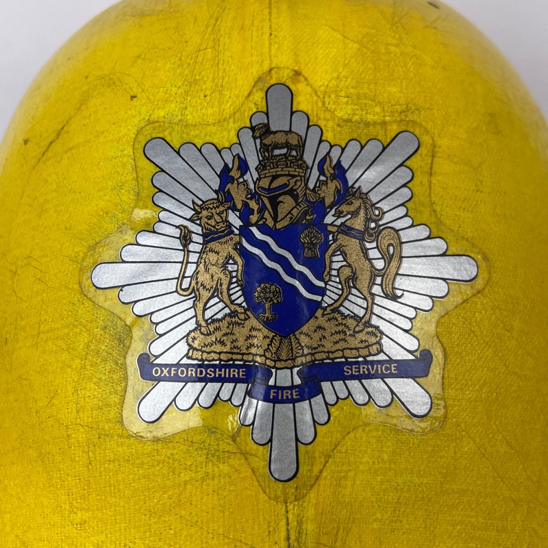 Casco amarillo de una sola pieza con cimera que recorre la parte superior del casco. El casco presenta en el frontal la calca del Departamento de Bomberos de Oxfordshire.