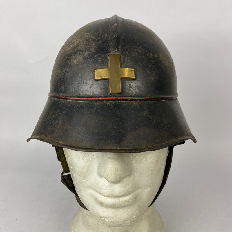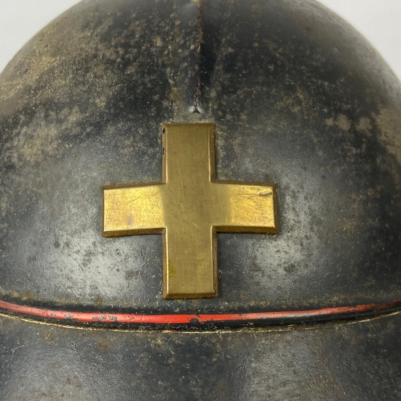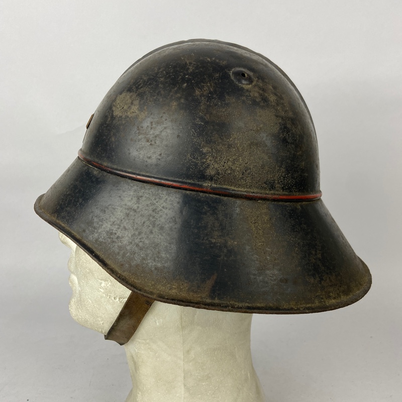 Franja roja que bordea completamente el casco y placa frontal de latón con forma de cruz, modelo de uso nacional. Interior de cuero formado por seis lengüetas y barboquejo de cuero con cierre mediante hebilla.