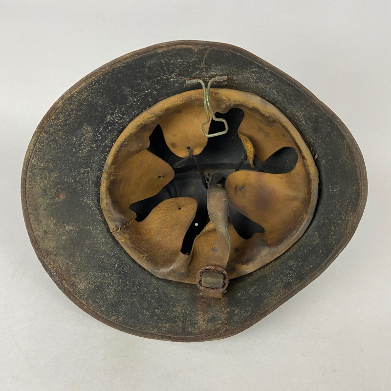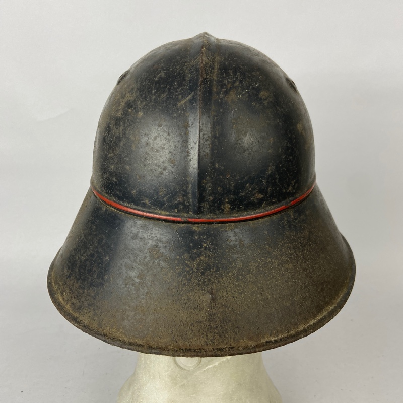 Casco de Bomberos Suizo, de latón, utilizado durante los años 40. Casco metálico pintado de color negro con interior con cresta superior de refuerzo.