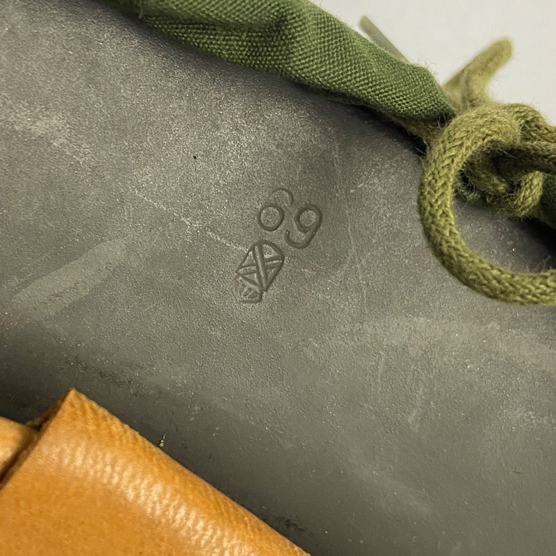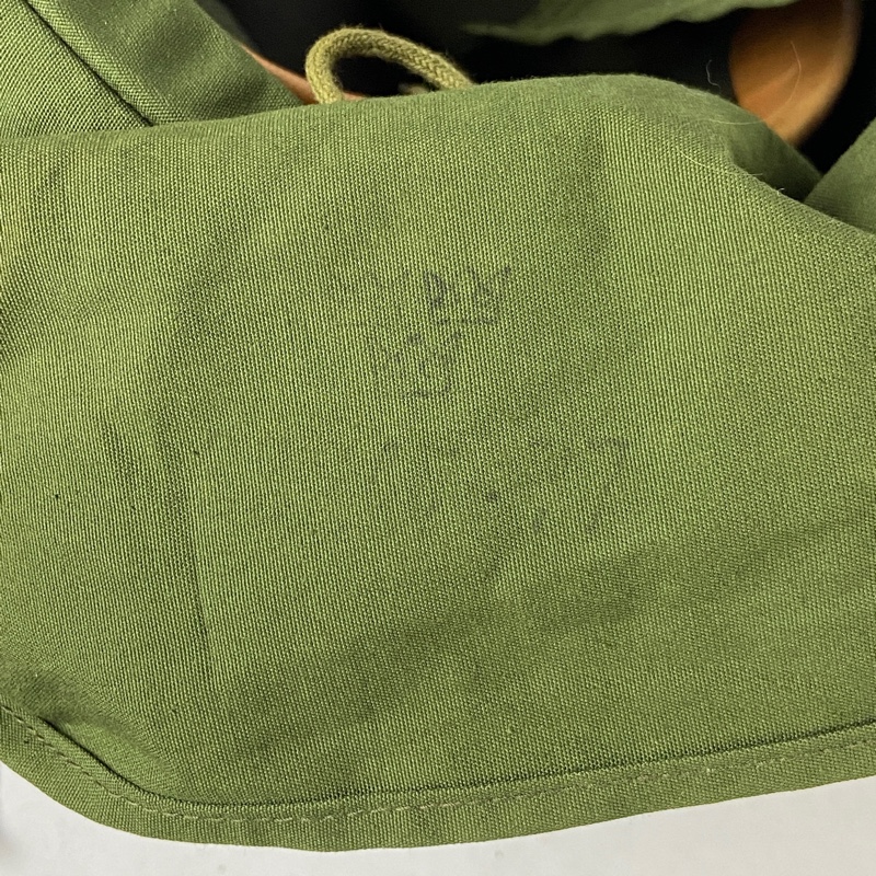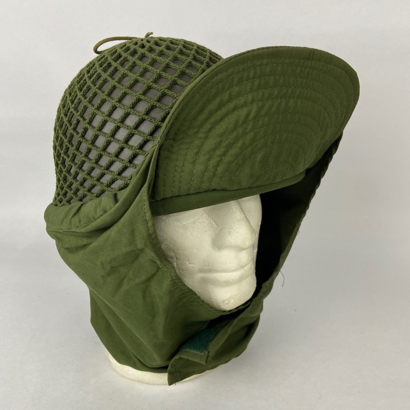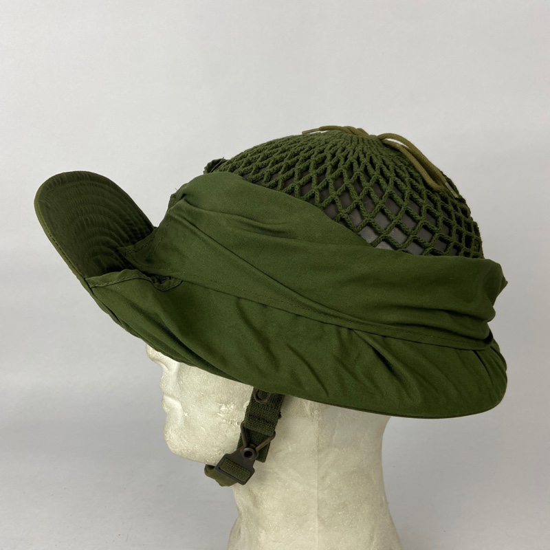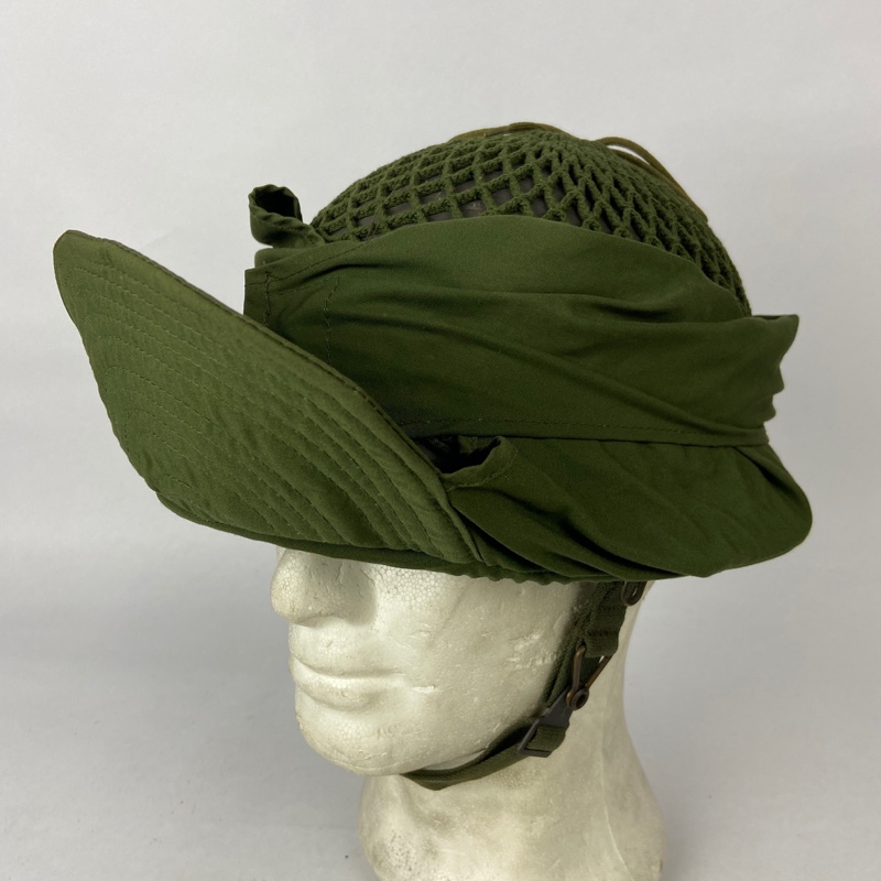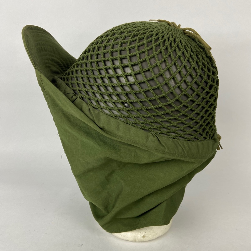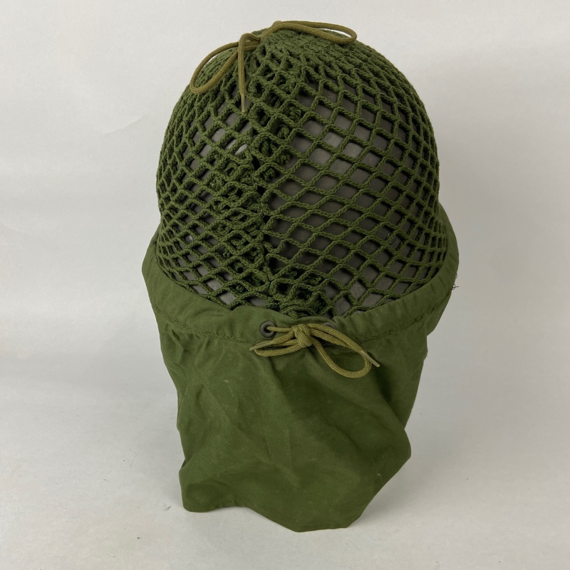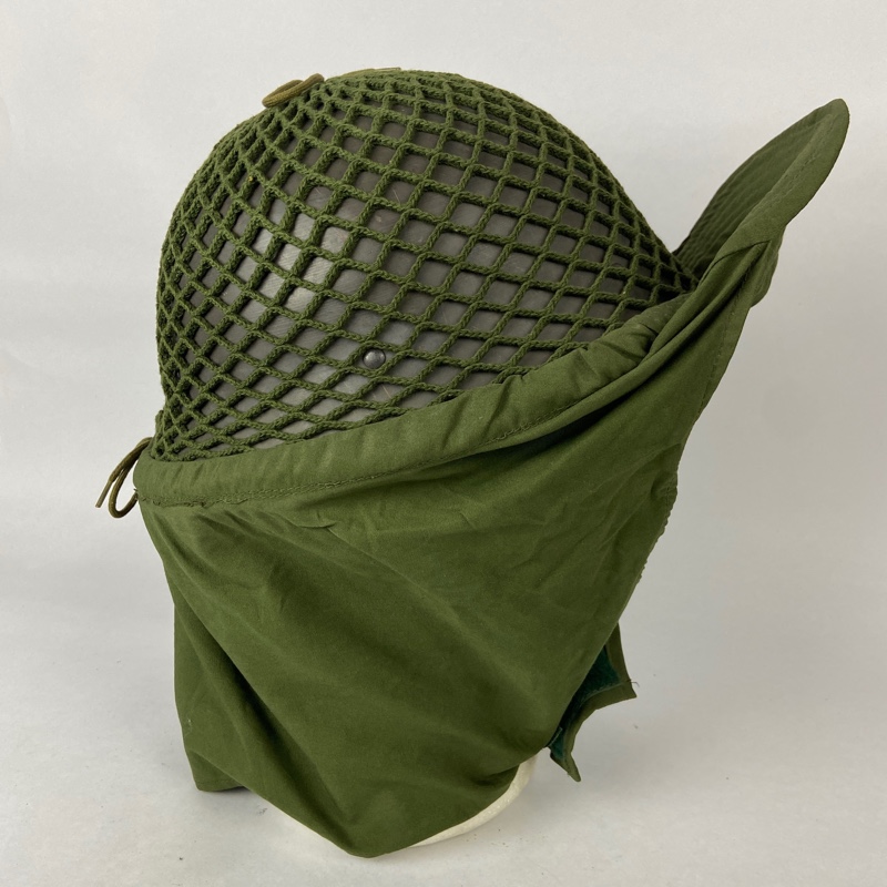 Casco de acero con guarnición de tela, unida mediante remaches al casco. Red de camuflaje que incorpora visera y orejeras, que se pueden desplegar para cubrir la cabeza en climas fríos.