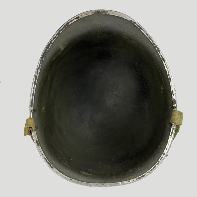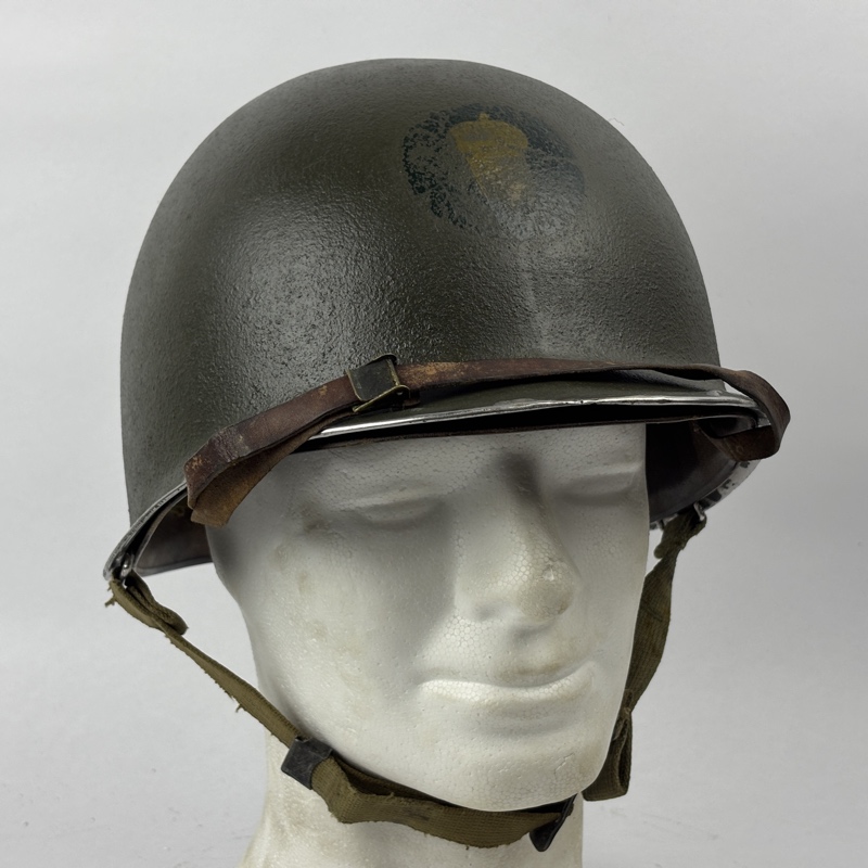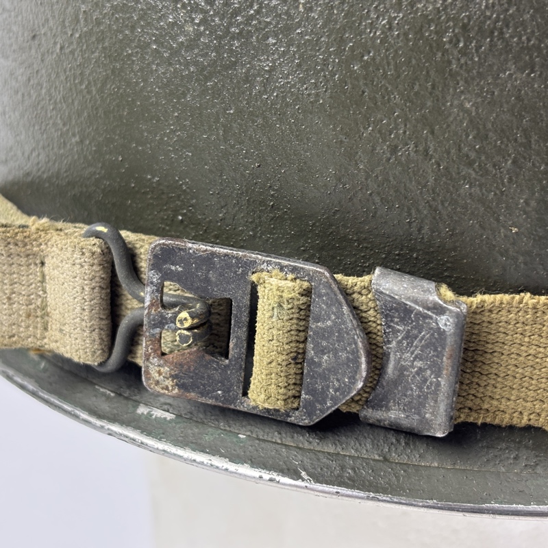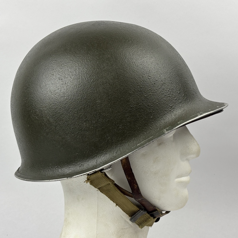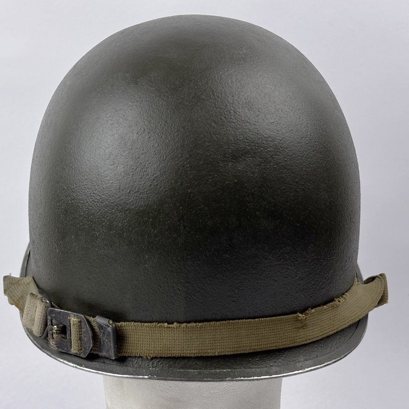 Casco M1 Americano utilizado durante la Segunda Guerra Mundial. Modelo con enganche fijo para el barbuquejo y corte delantero en el reborde.