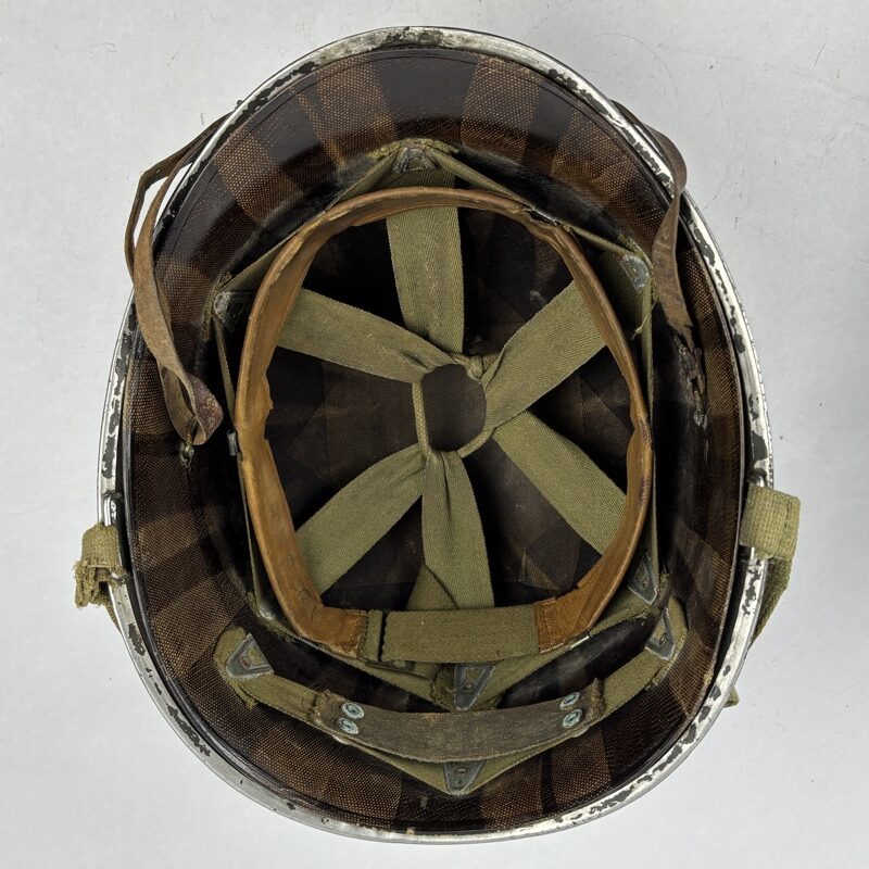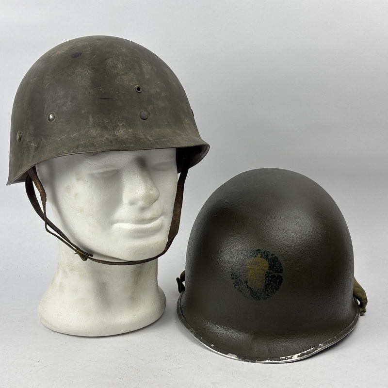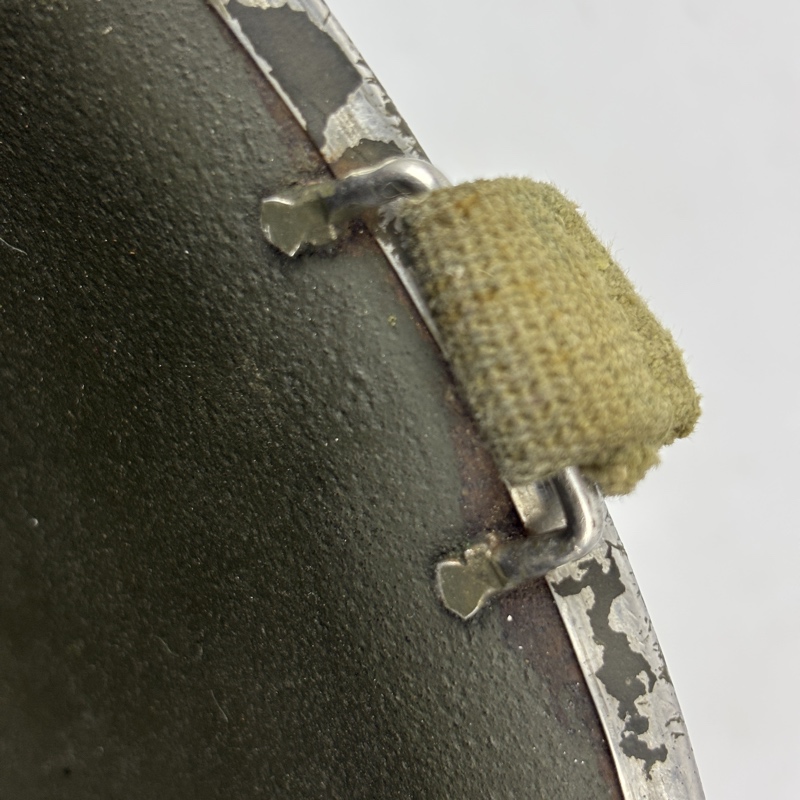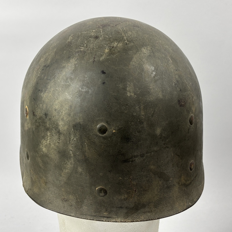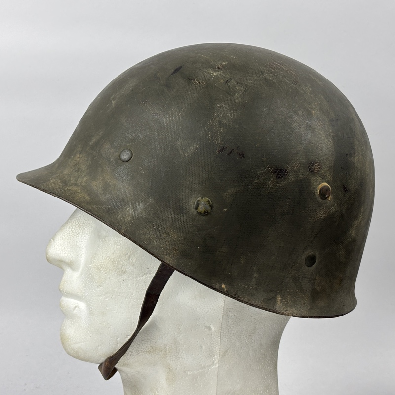 Casco M1 Americano utilizado durante la Segunda Guerra Mundial. Modelo con enganche fijo para el barbuquejo y corte delantero en el reborde.