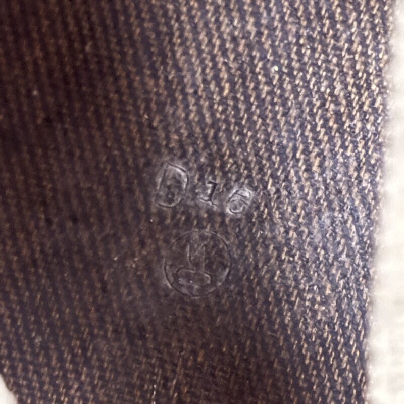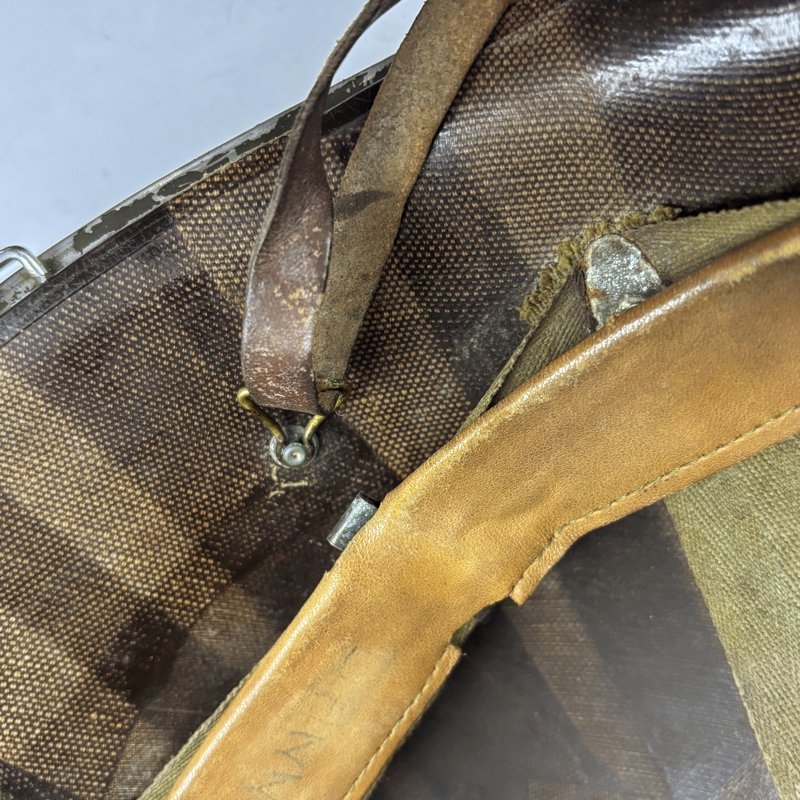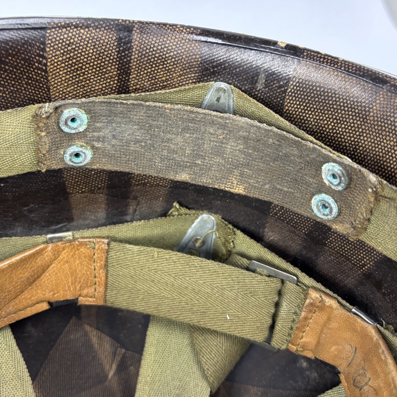 Interior correspondiente con barboquejo de cuero y de lona. Zuncho ajustable para diversas medidas de cabeza, con marcaje en el fondo del mismo, fabricado por Westinhouse con número de lote.