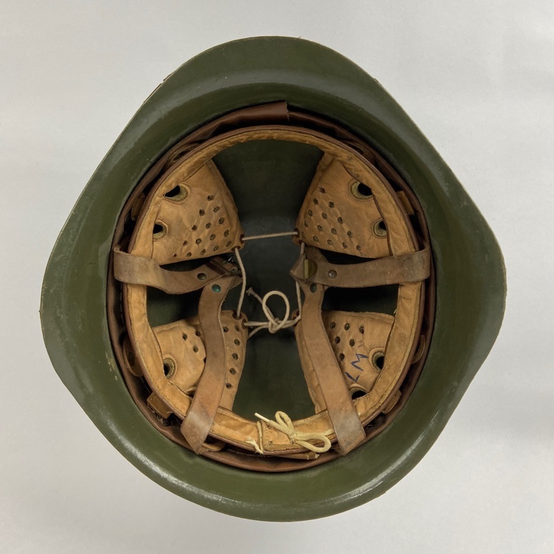 Interior con sistema de suspensión de cuero multipieza y barboquejo original húngaro. Casco sólido, con desgaste superficial acorde al uso, tal como se aprecia en las fotografías.