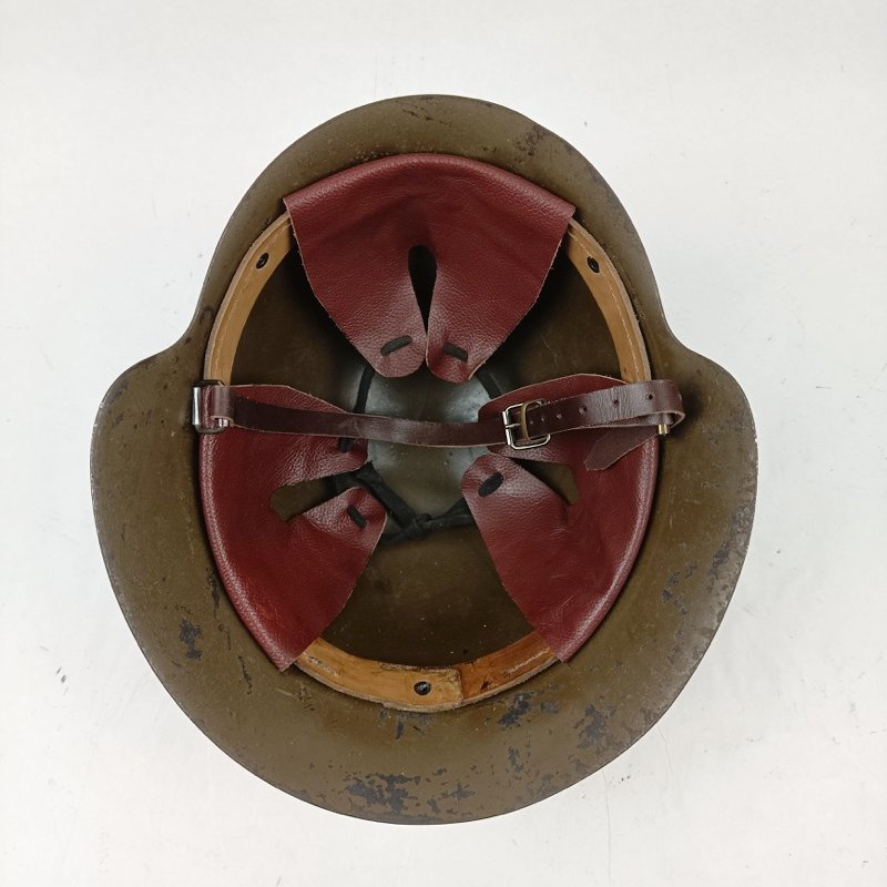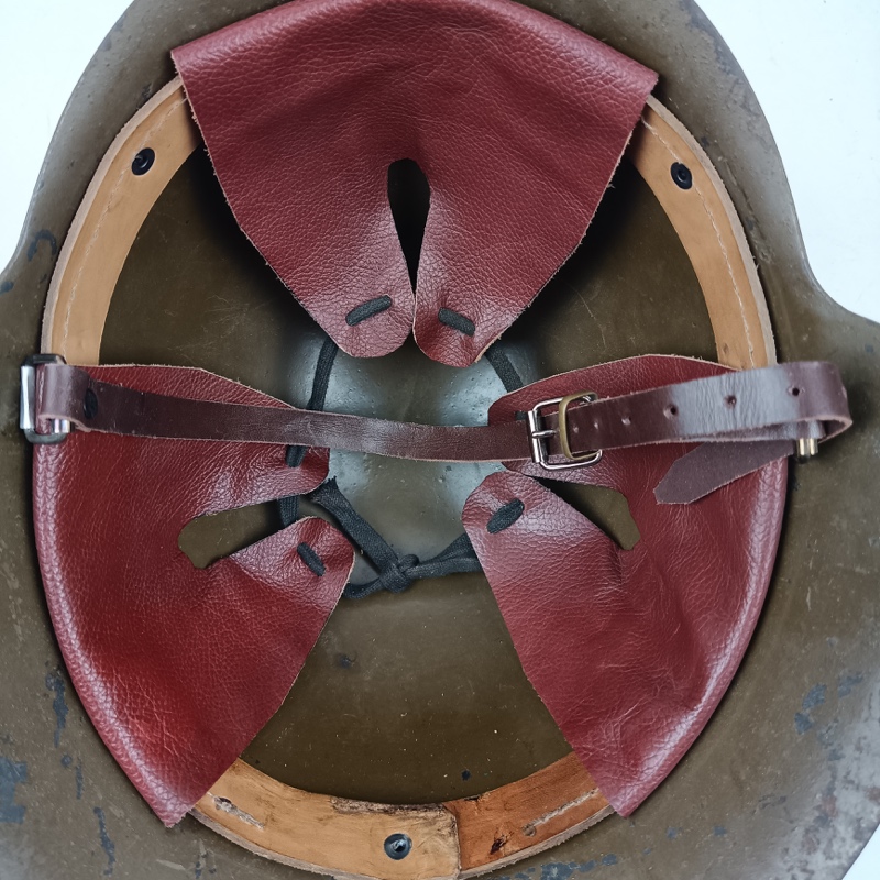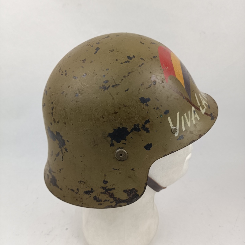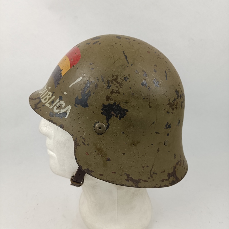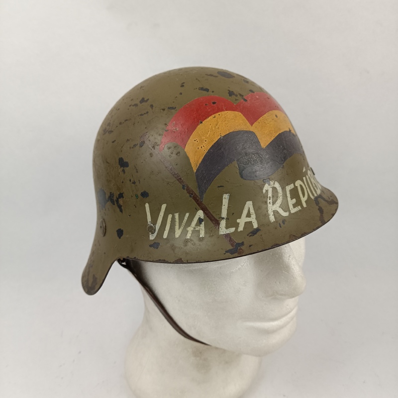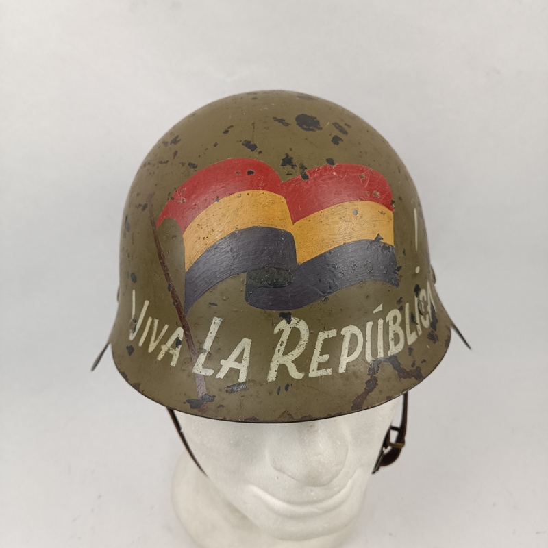 Casco de acero de color verde fabricado y utilizado durante la Guerra Civil Española por ambos bandos. Original sin gancho frontal. Pintura de la Republica Española en el frontal restaurada (No de época). Cuero de reposición, de aspecto realista, muy parecido al original.