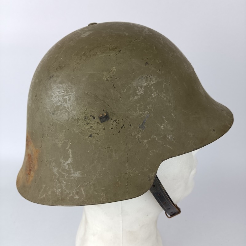 Casco de acero de color verde fabricado y utilizado durante la Guerra Civil Española por ambos bandos. Interior original de cuero formado por cuatro lengüetas que se unen mediante un soporte metálico a la parte superior del casco.