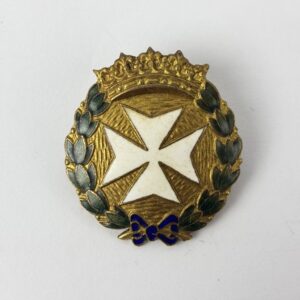 Chapa esmaltada de Caballero Legionario de la Legión Española, original fabricada en dos piezas metálicas. Placa dorada con emblema de la legión en el centro, con detalles en esmaltes, algunos de los cuales han saltado debido a la antiguedad de la propia pieza.