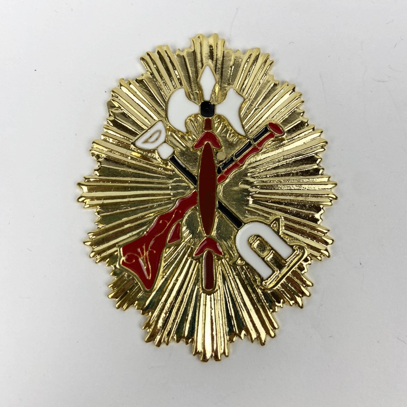 Fabricada en metal dorado con esmaltes en colores rojo, negro y blanco. Utilizada en carteras portaplaca.