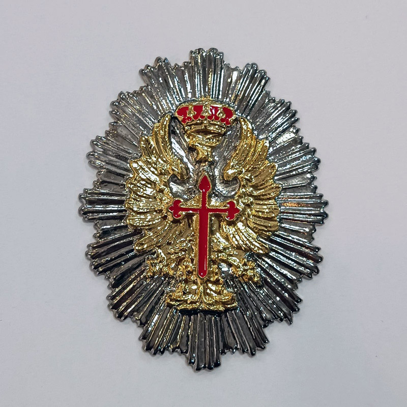 Placa de cartera del Ejercito de Tierra del Ejercito Español, fabricada en dos piezas metálicas, con fondo de acabado niquelado y águila dorada remachada en el frontal con el centro esmaltado de color rojo. Cartera para placas también disponible en tienda.