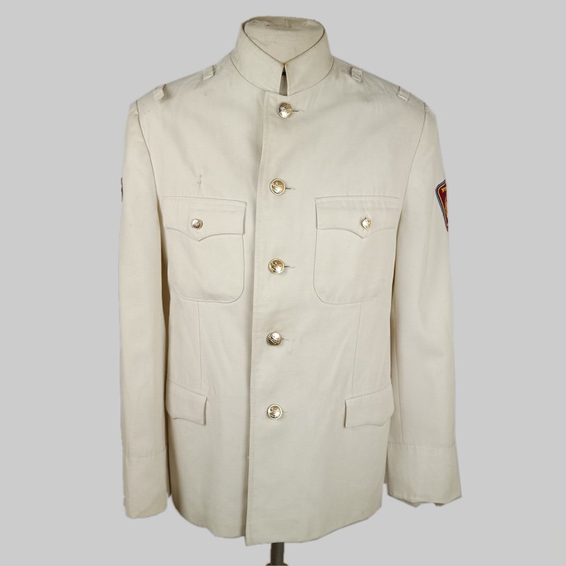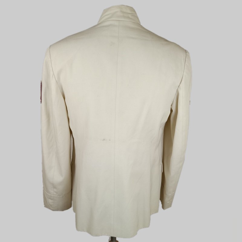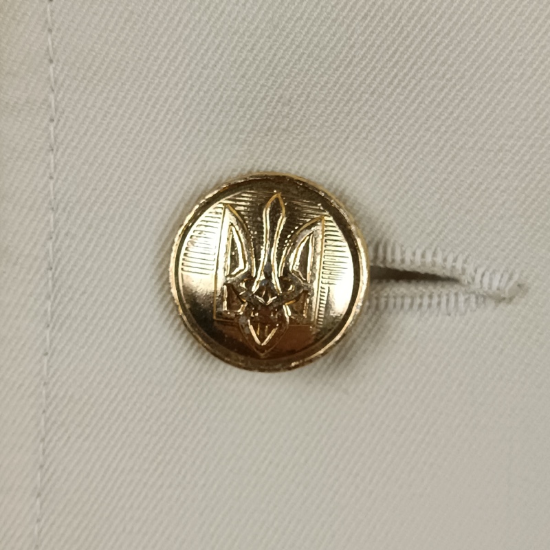 Guerrera de paseo en color blanco correspondiente a uniforme de alumno del Liceo Militar de Ucrania. Presenta cierre frontal mediante botones metálicos con el tridente ucraniano (Tryzub), dos bolsillos superiores con tapeta y bolsillos inferiores laterales, así como cuello alto recto de estilo reglamentario.