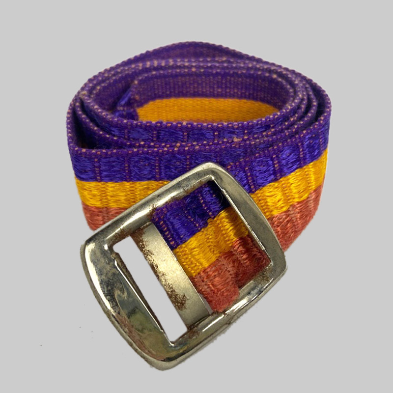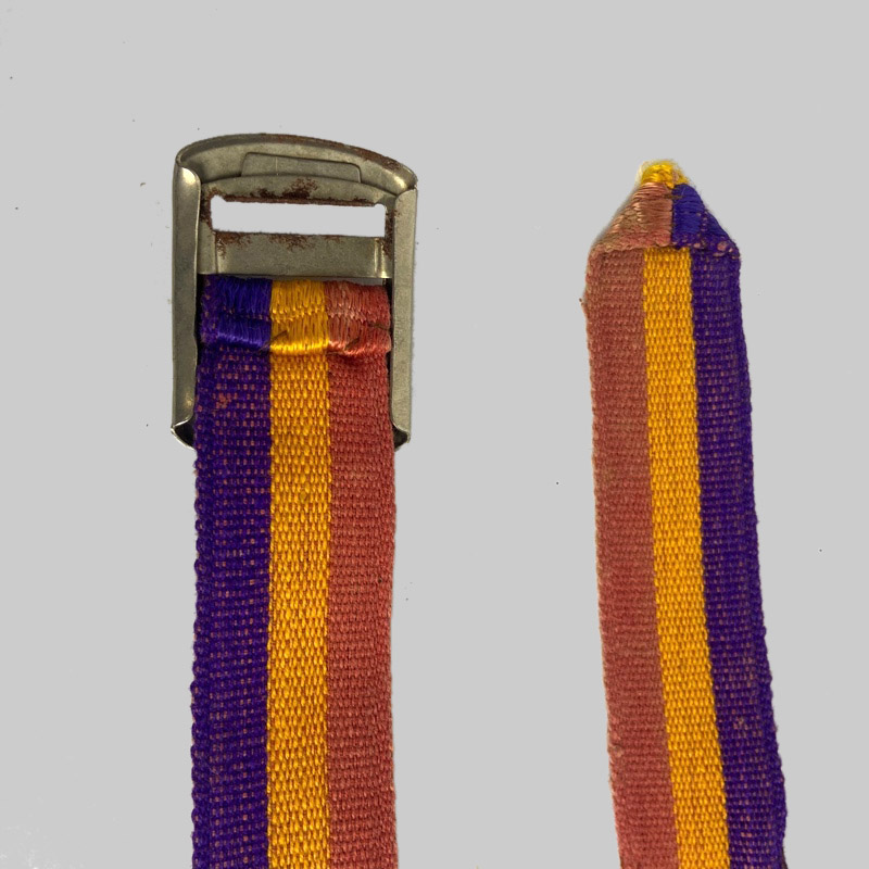 Antiguo cinturón de tela con los colores de la bandera Republicana, utilizado por la 2ª republica entre 1931 y 1939. Cinturón de tela de algodón y hebilla metálica pasante para cerrarlo, en buen estado general, con signos de desgaste debido a la antigüedad de la pieza pero bien conservado. 3 cm de anchura.