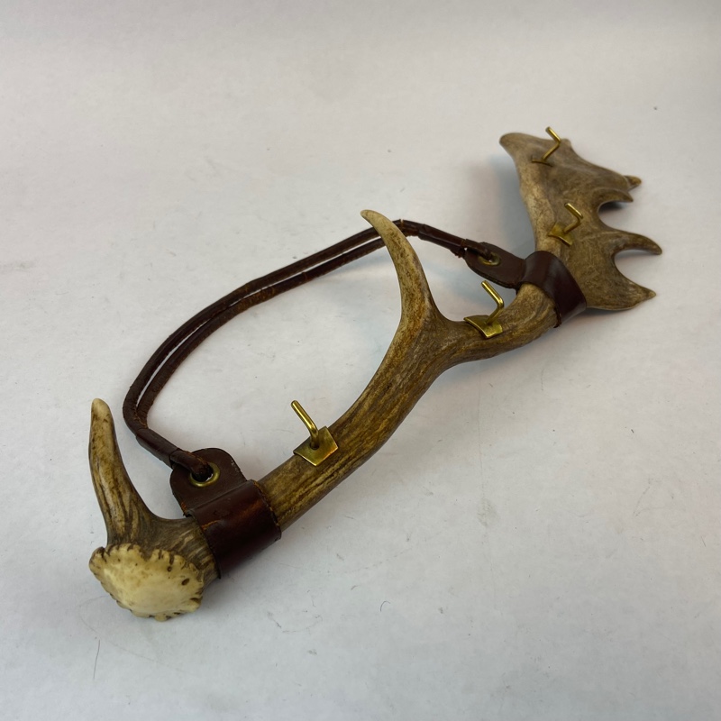 Colgador artesanal elaborado a partir de asta auténtica, con detalles en cuero y herrajes metálicos en tono dorado. Cada pieza es completamente única debido a la forma natural del asta.
