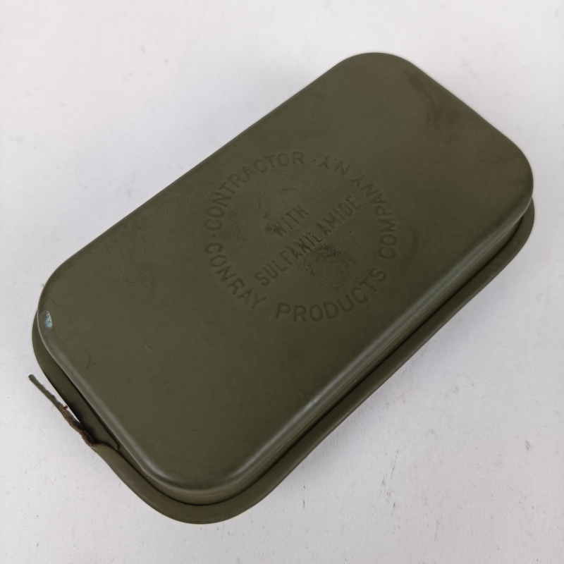 Paquete de vendas Americanas, originales sin usar de la Segunda Guerra Mundial. Empaquetadas en su embalaje original formado por dos piezas de hojalata verde con un cierre metálico. En buen estado con marcajes en el paquete perfectamente legibles. Versión con Sulfanilamida para detener hemorragias.