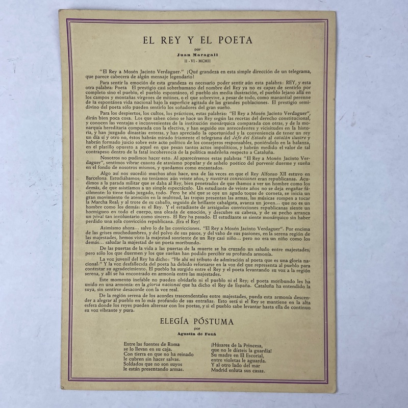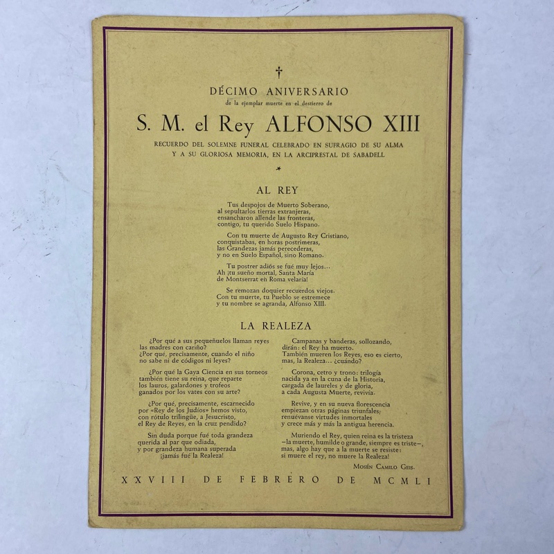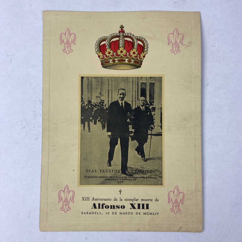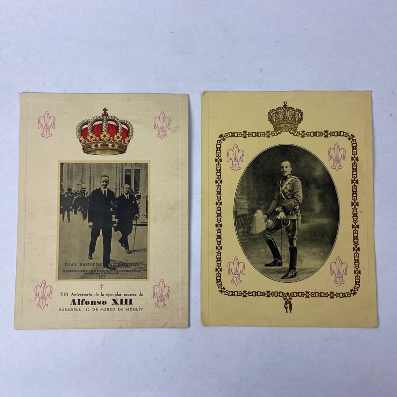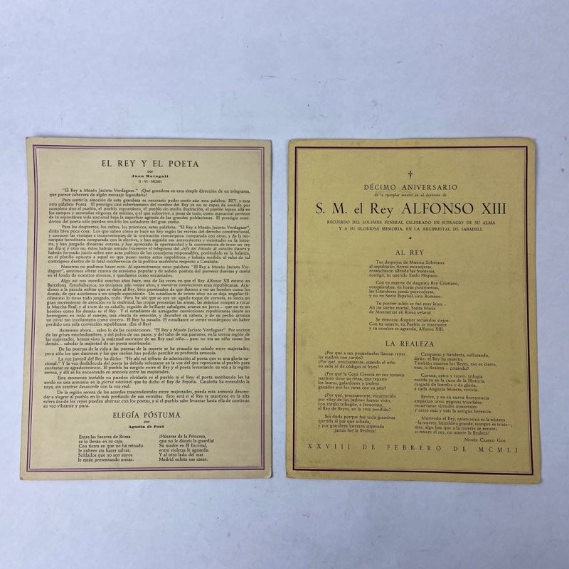 Uno de los impresos corresponde al XIII aniversario de la ejemplar muerte de Alfonso XIII, celebrado en Sabadell el 10 de marzo de 1954. El otro conmemora el décimo aniversario de su fallecimiento en el exilio, con textos dedicados a su figura y a la monarquía española.