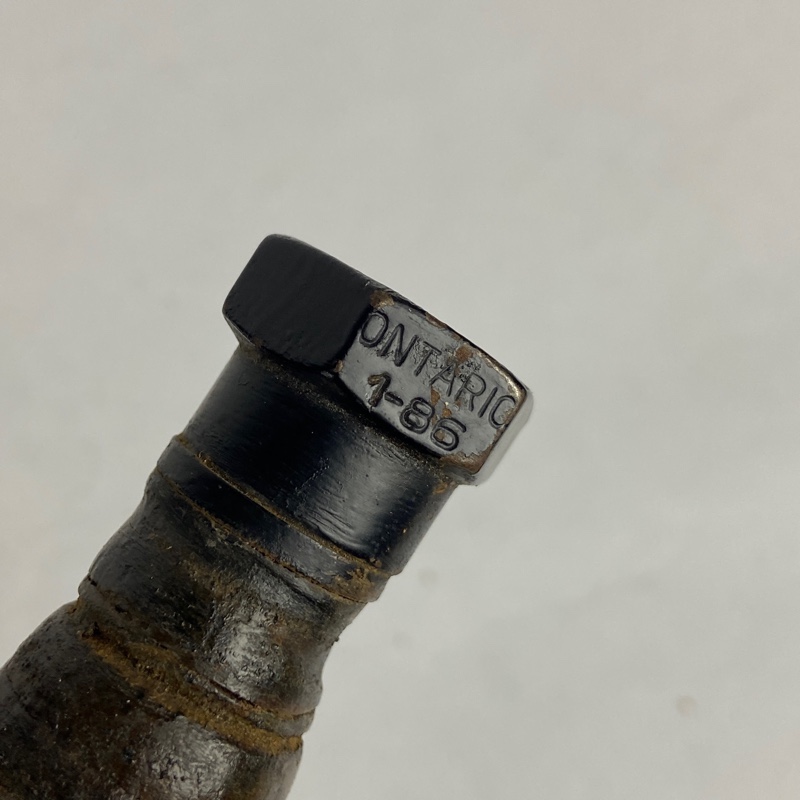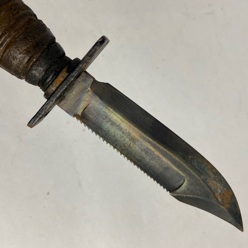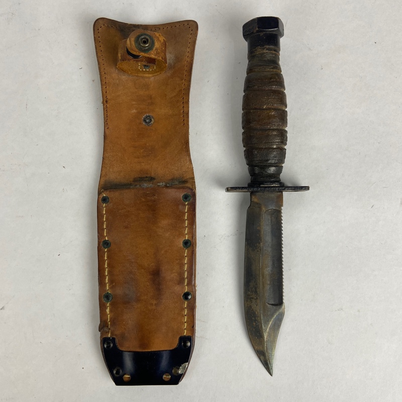 Cuchillo Ontario de Piloto Americano, hecho en acero pavonado y con empuñadura de cuero. En buen estado de conservación.