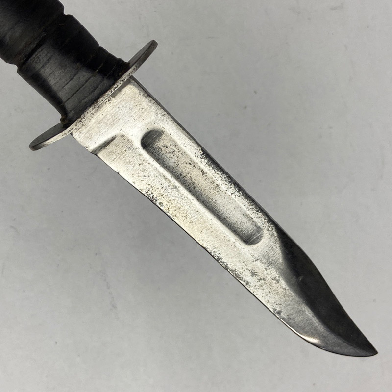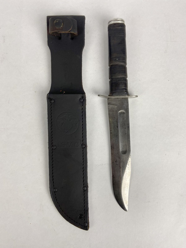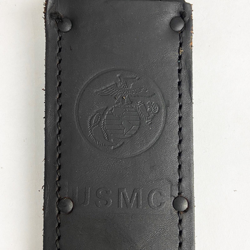 Cuchillo combate con marca de fabricación en el ricasso, bien definido, sin parkerizado con hoja pulida. Funda no original envejecida, con el símbolo del Cuerpo de Marines de los estados Unidos (USMC) en relieve.