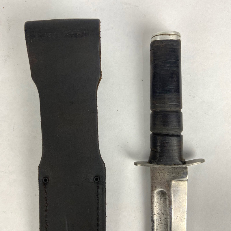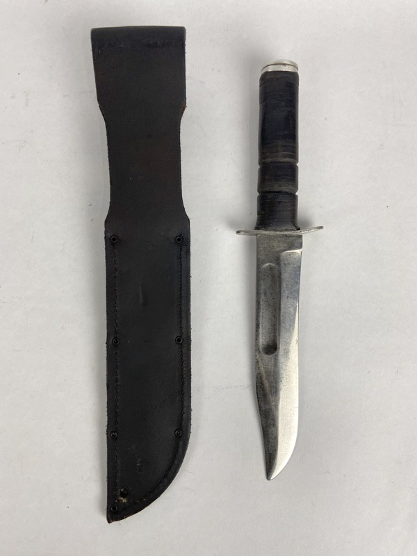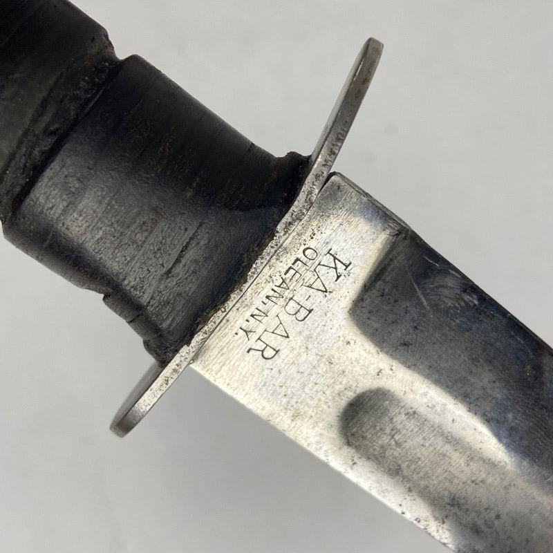 Cuchillo KA-BAR del Ejército de los Estados Unidos, fabricado por OLEAN N.Y. durante la Segunda Guerra Mundial. Mango de cuero con desgaste.
