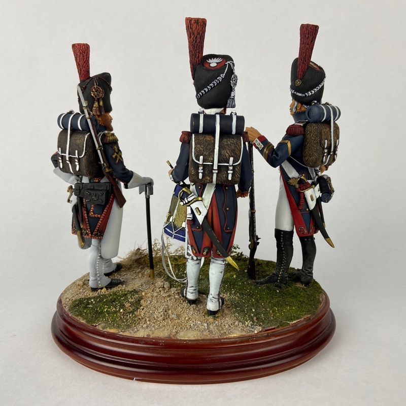 Diorama en miniatura napoleónico a escala 120 mm (1:16) compuesto por tres figuras diferentes de infantería francesa, montadas sobre peana escénica ovalada con terreno trabajado y base de madera barnizada. Conjunto correspondiente a tropas francesas del período napoleónico, con uniformidad característica de granaderos y oficiales de infantería.