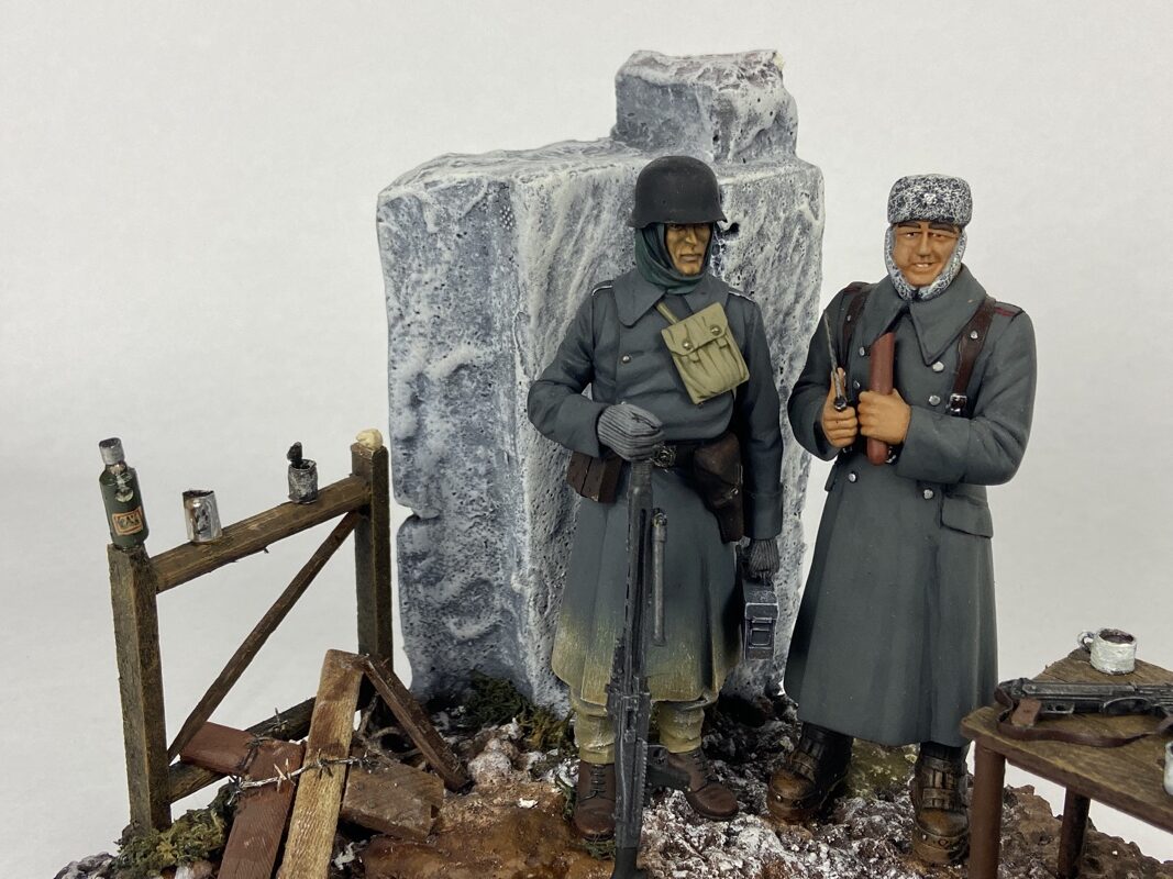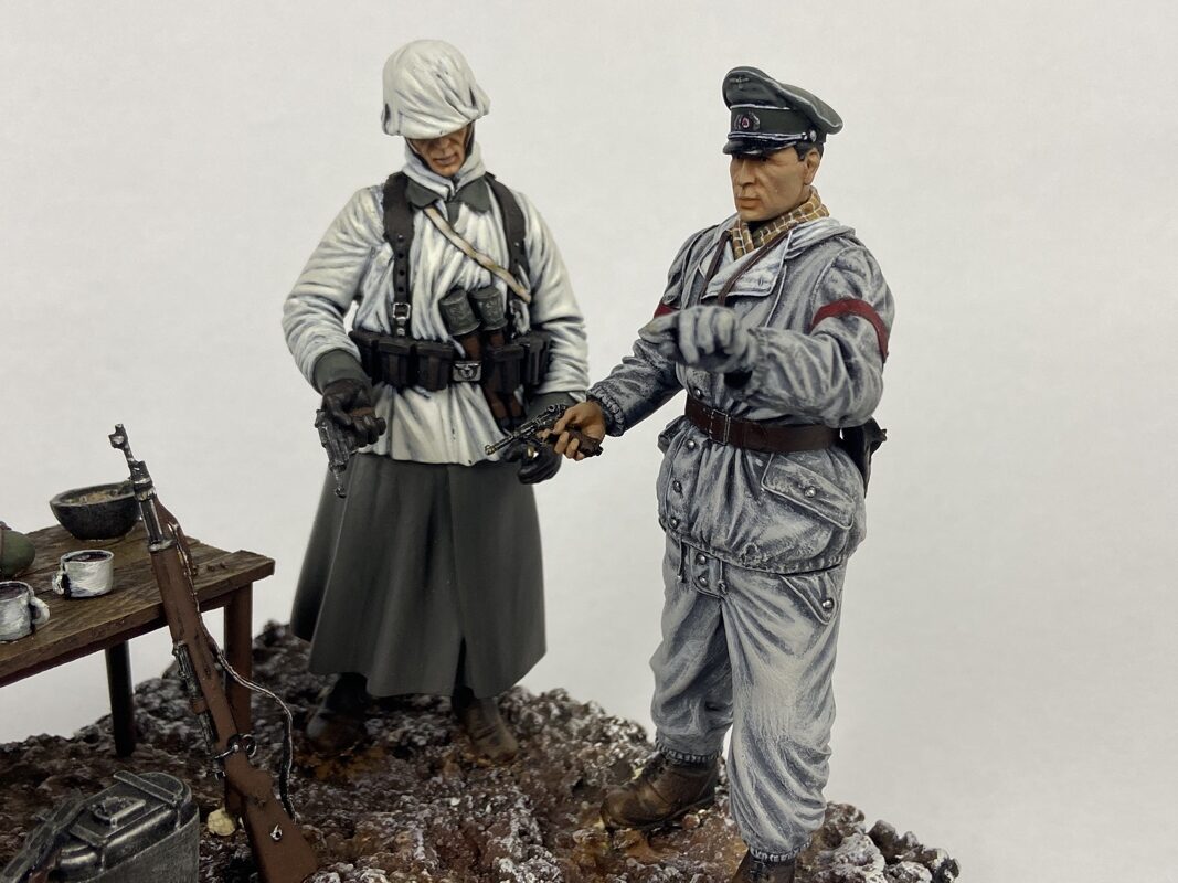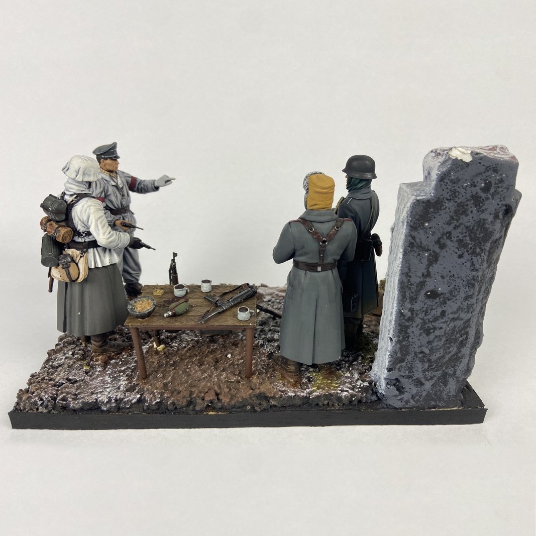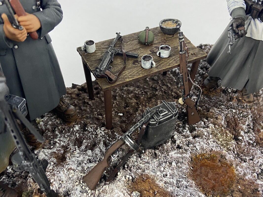 Diorama a escala 1:16 que representa una escena de soldados alemanes en el Frente Oriental durante el invierno de 1942. El conjunto muestra a cuatro soldados alemanes equipados con uniformes de invierno, reunidos junto a una mesa improvisada con armamento y equipo en una posición de campaña.
