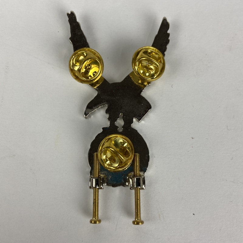 Pin o Insignia de permanencia de las Fuerzas Paracaidistas, consiste en un águila sujetando entre sus garras una corona de laurel con un paracaídas abierto en esmalte blanco sobre fondo azul. En estado nuevo.