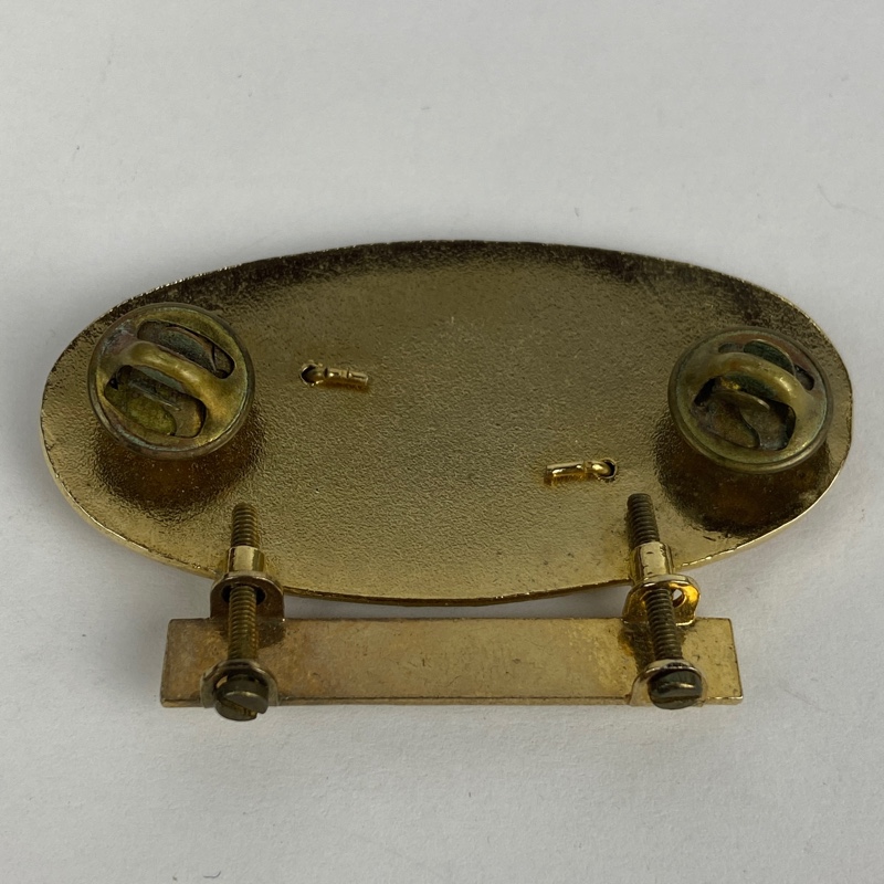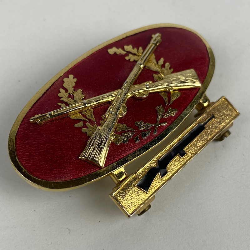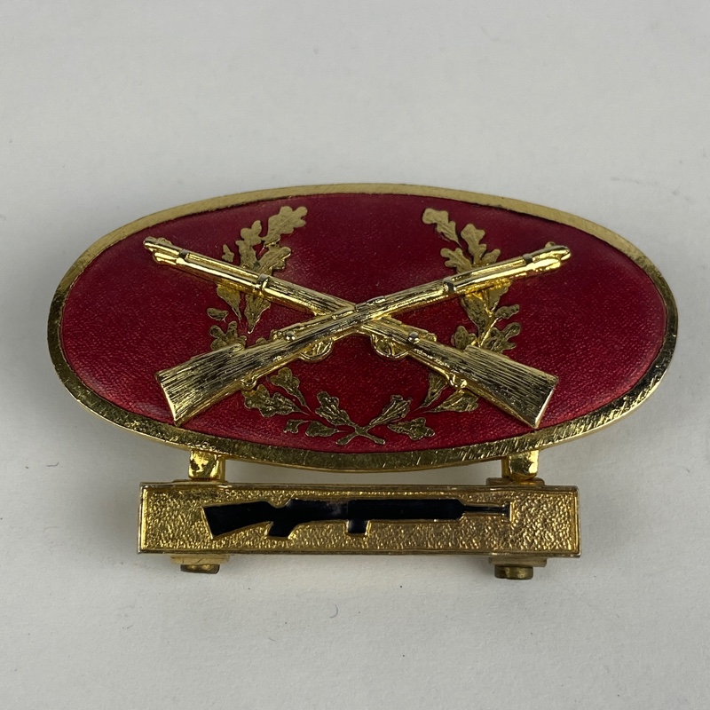 Insignia metálica de tirador selecto con acabado dorado, de forma elíptica con reborde en oro, de 60 mm de anchura y 30 mm de altura. Centro o campo del distintivo de esmalte rojo brillante con una corona de hojas de roble, sobre la que se superponen dos rifles Mauser del Ejercito Español enganchados mediante dos pasadores en la parte posterior.