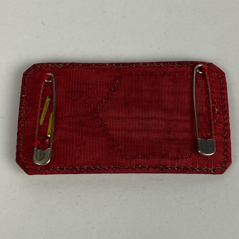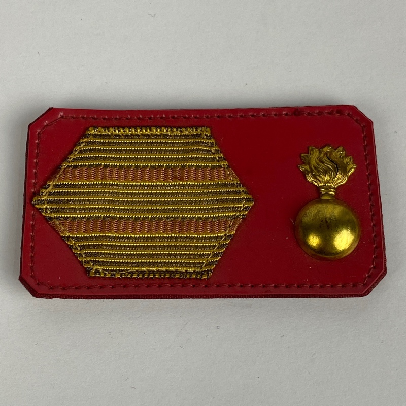 Galleta de color rojo para unir sobre el bolsillo de la guerrera, con divisa de Sargento y símbolo del arma de artillería metálicos. En buen estado general.