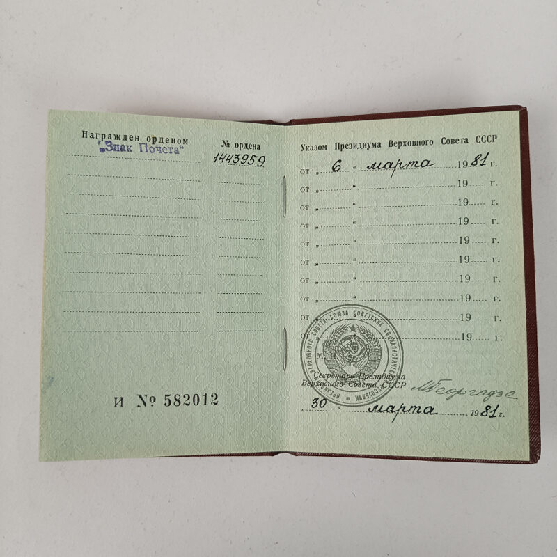 Documento de la Medalla de la Orden de Honor de la URSS (Unión Soviética).
