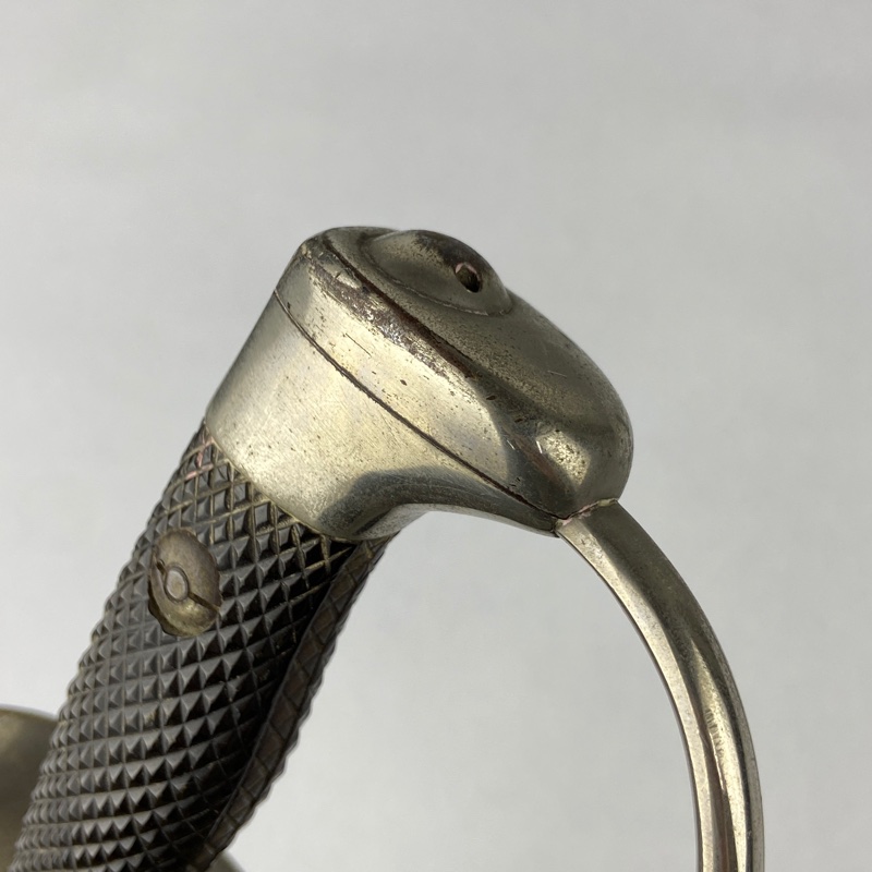 Cazoleta de la espada lisa, sin inscripción ni distintivo del cuerpo al que pertenece, característico de estos modelos iniciales.