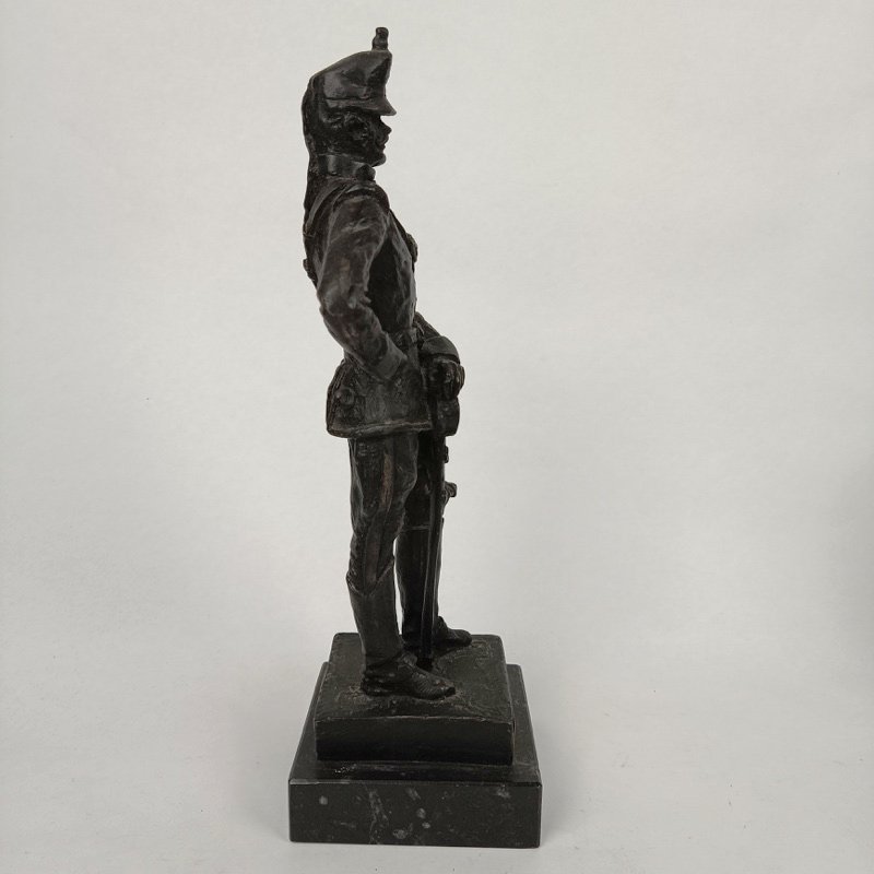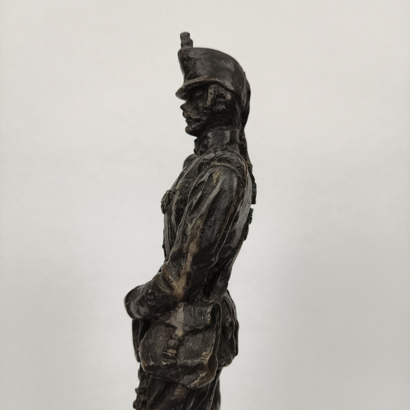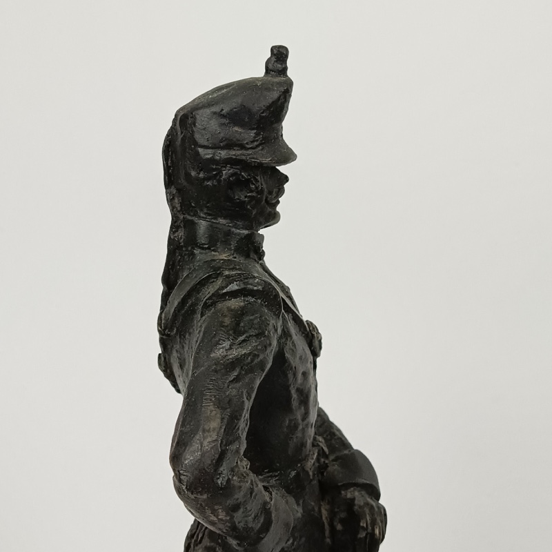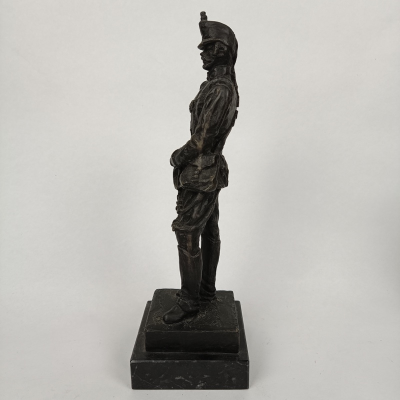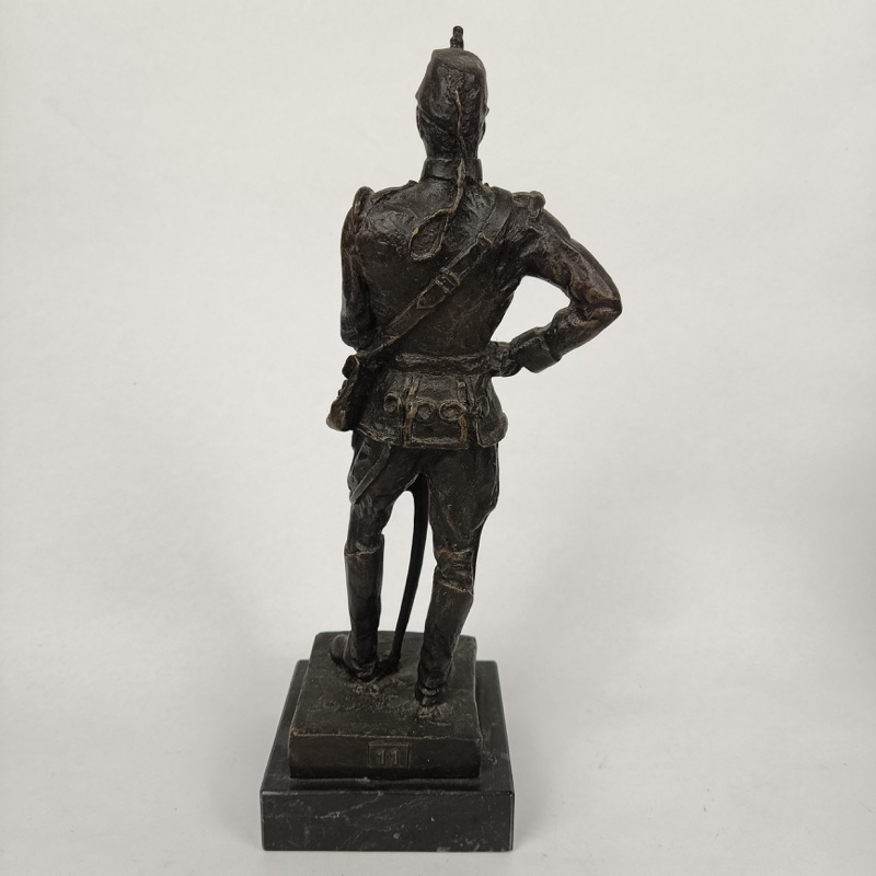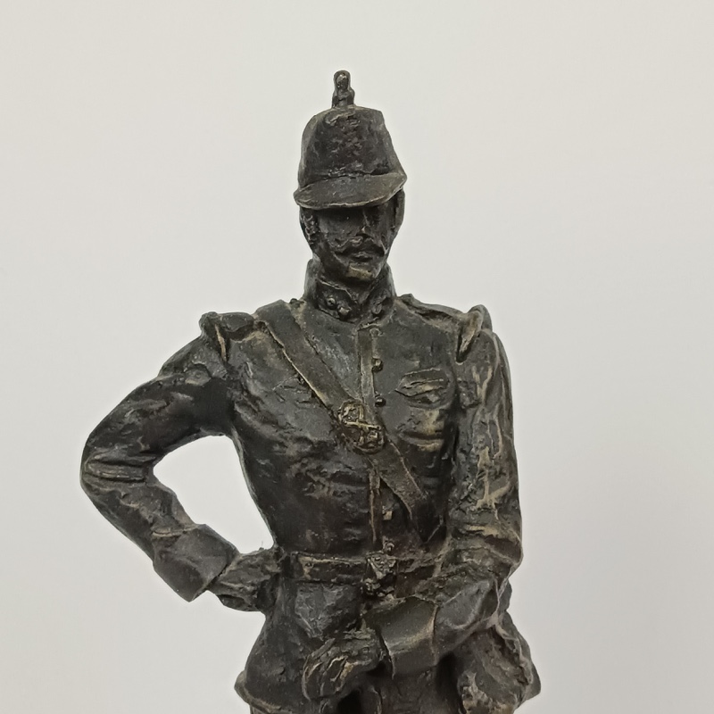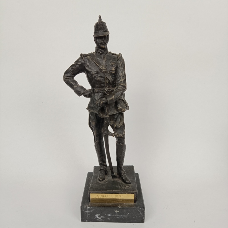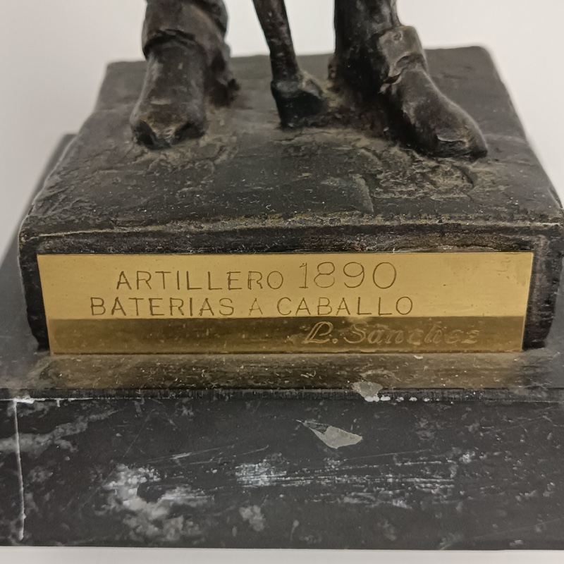 Escultura militar de Oficial de Artillería de las Baterías a Caballo con uniforme de 1890, realizada en resina chapada en bronce y montada sobre mármol por el escultor Luis Sánchez Pibe. Dimensiones 31 cm de alto x 10 cm de ancho con peana. Peso 1,432 kg