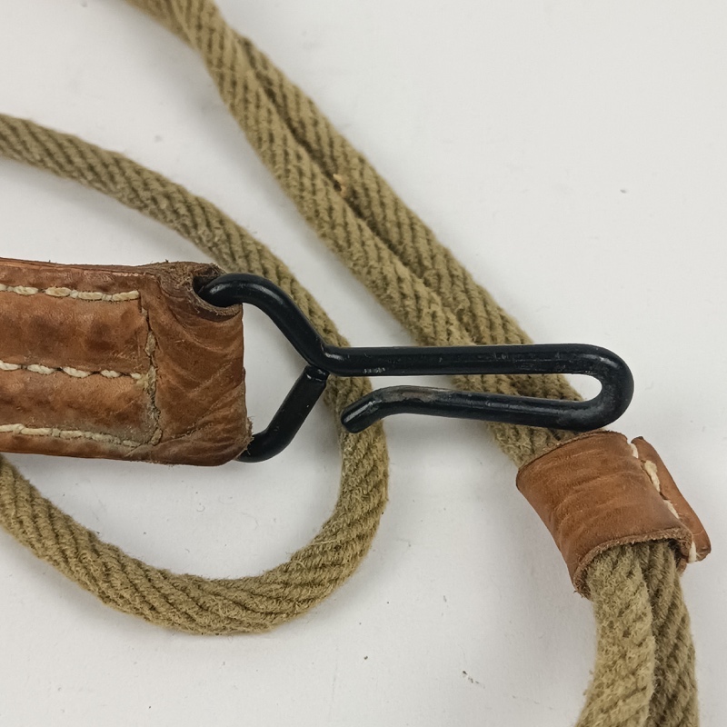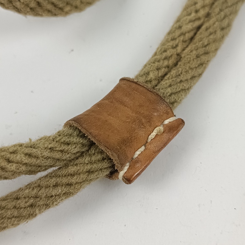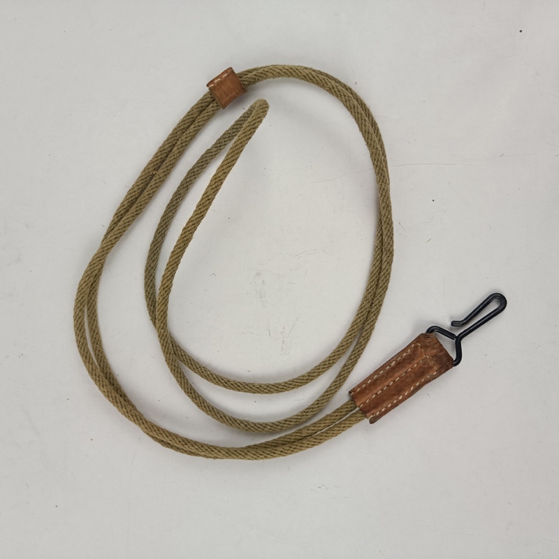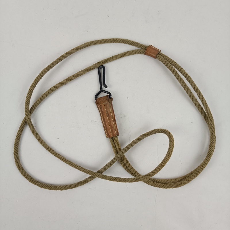 Fiador para arma corta compatible con pistola Colt 1911, fabricado en cordón textil color caqui con refuerzos en cuero cosido y gancho metálico de sujeción. Utilizado para asegurar la pistola al uniforme o cinturón, evitando su pérdida durante el servicio o maniobras.