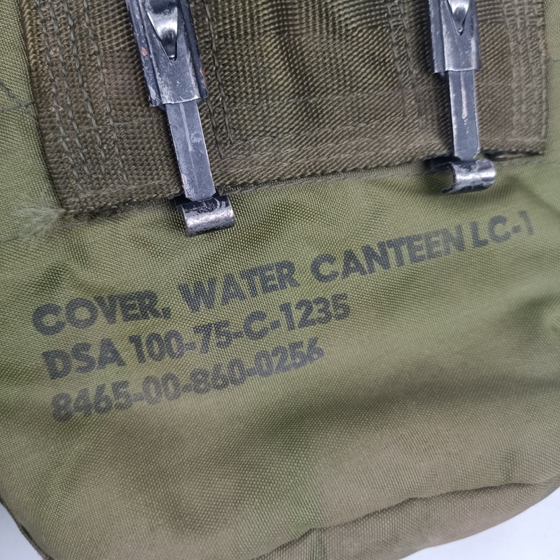 Funda original LC-1 confeccionada en lona verde oliva, con cierre por botones metálicos y enganches tipo ALICE para equipo de combate. Marcaje visible “Cover Water Canteen LC-1” y numeración de contrato.